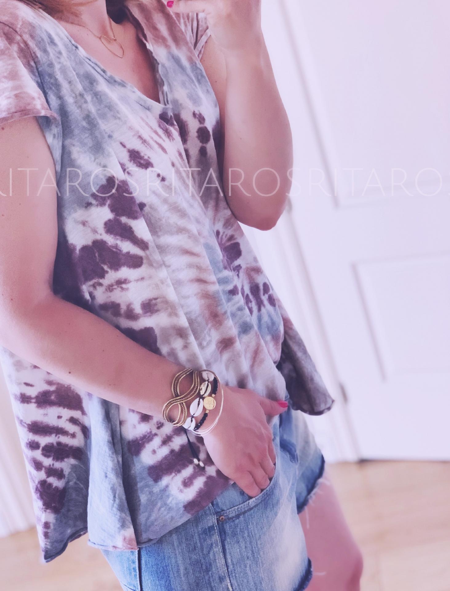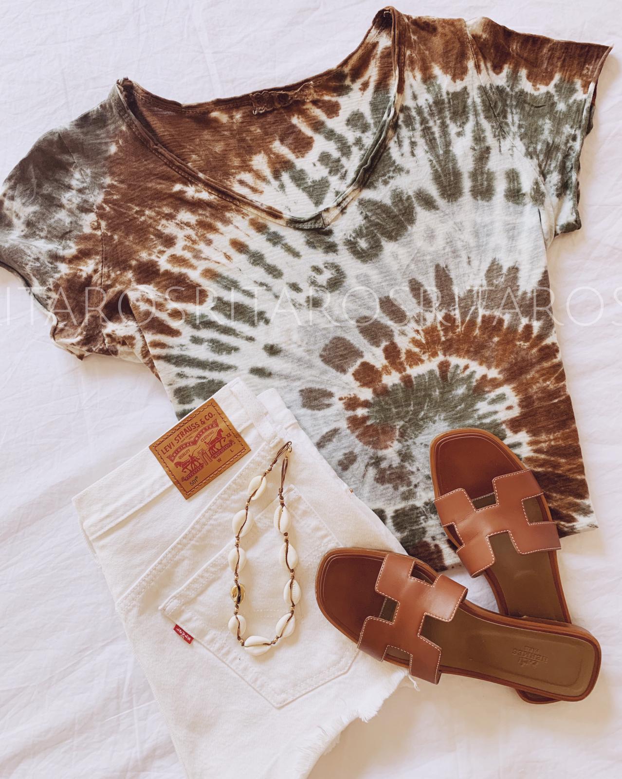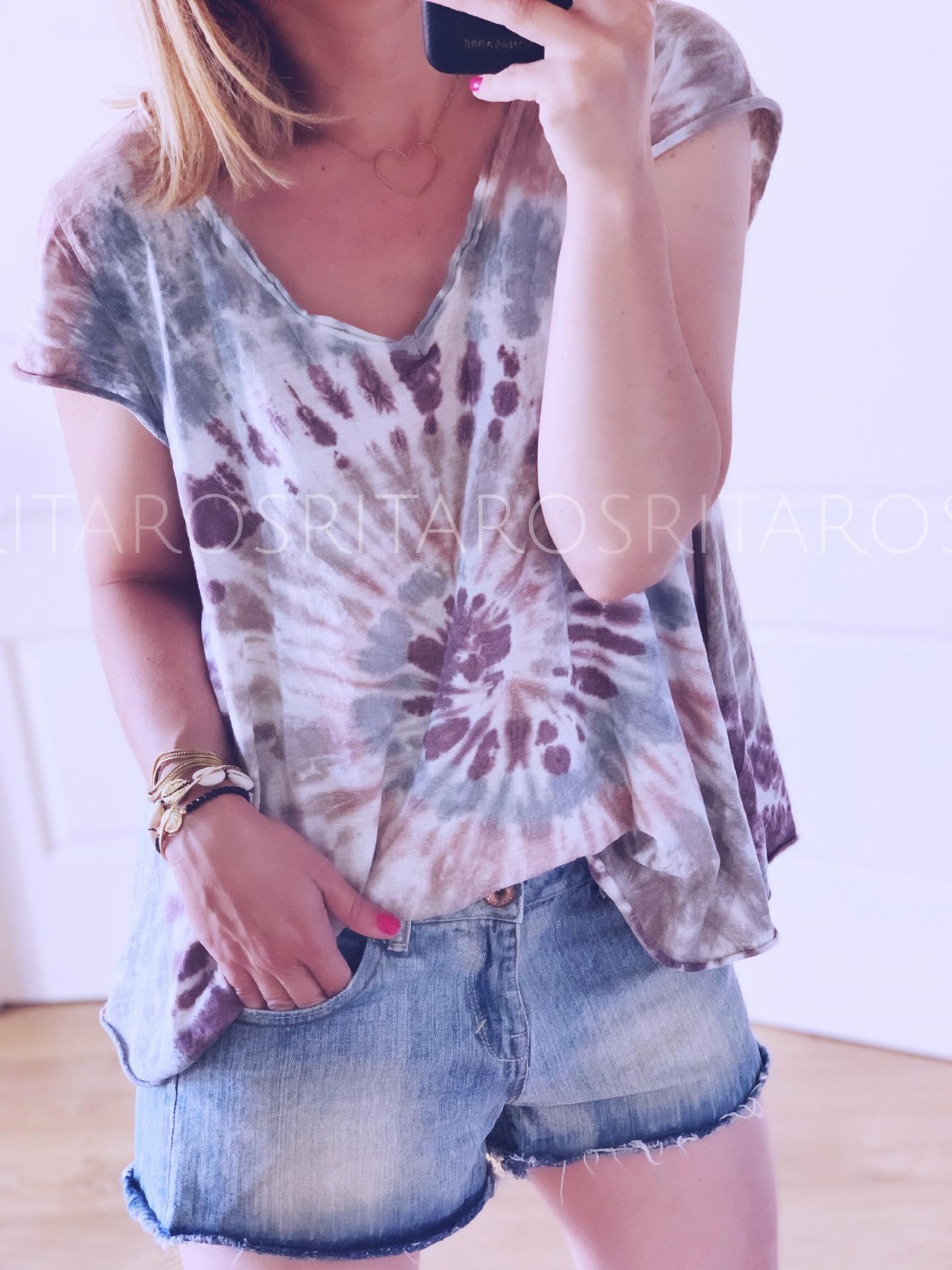 Camiseta de algodón de corte acampanado estampada estilo Tie Dye. Manga corta y cuello de pico.