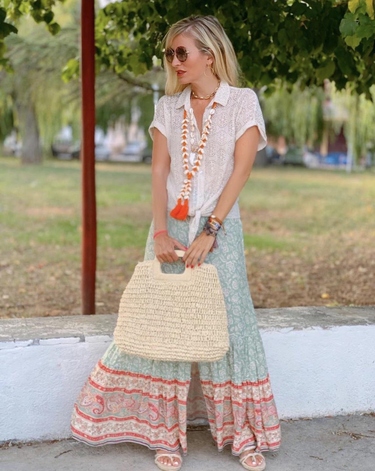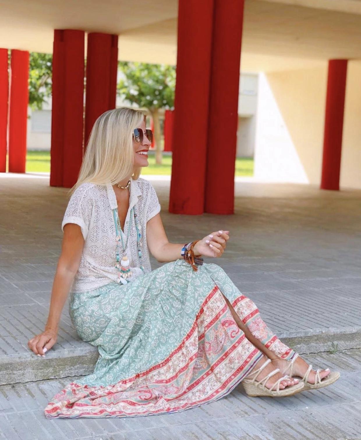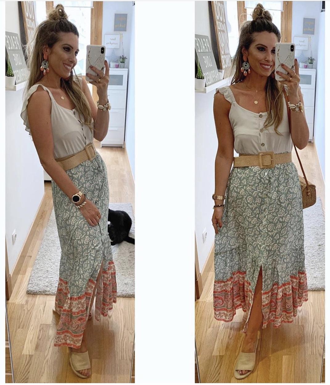 Falda larga estampada con cintura con goma elástica por detrás de la cintura.