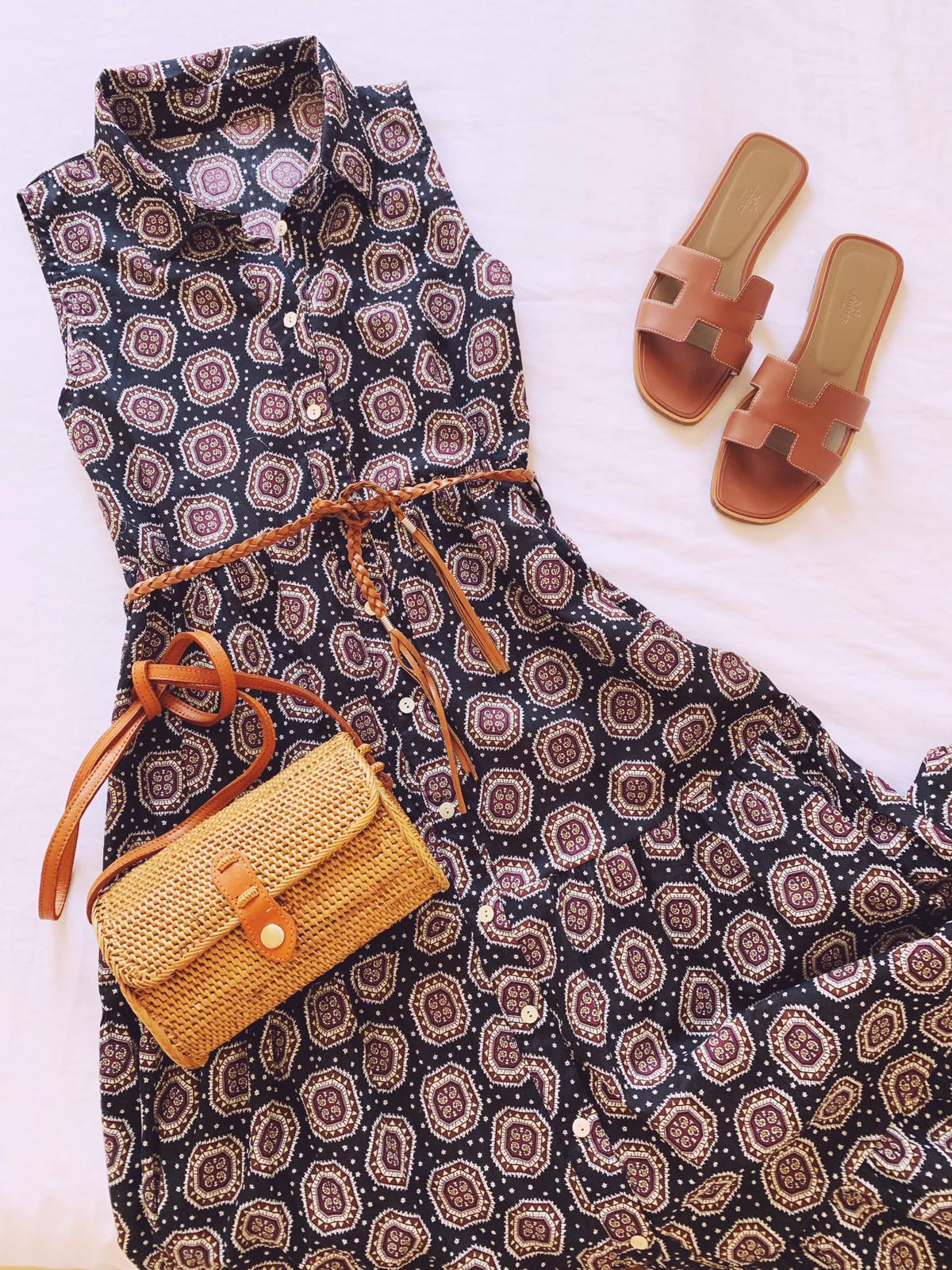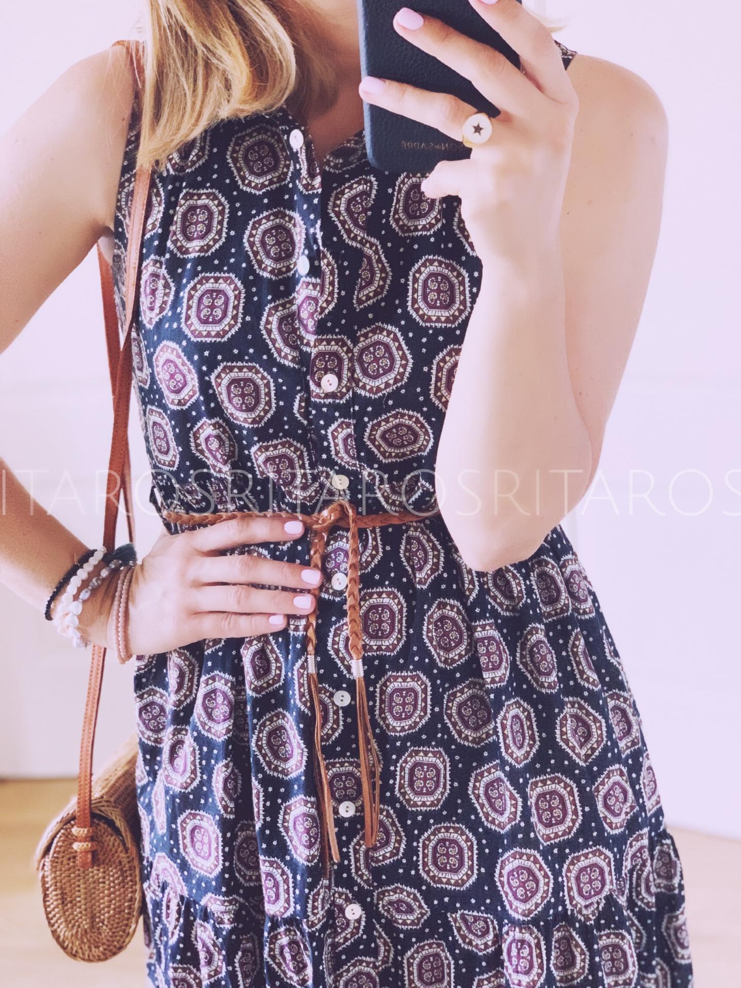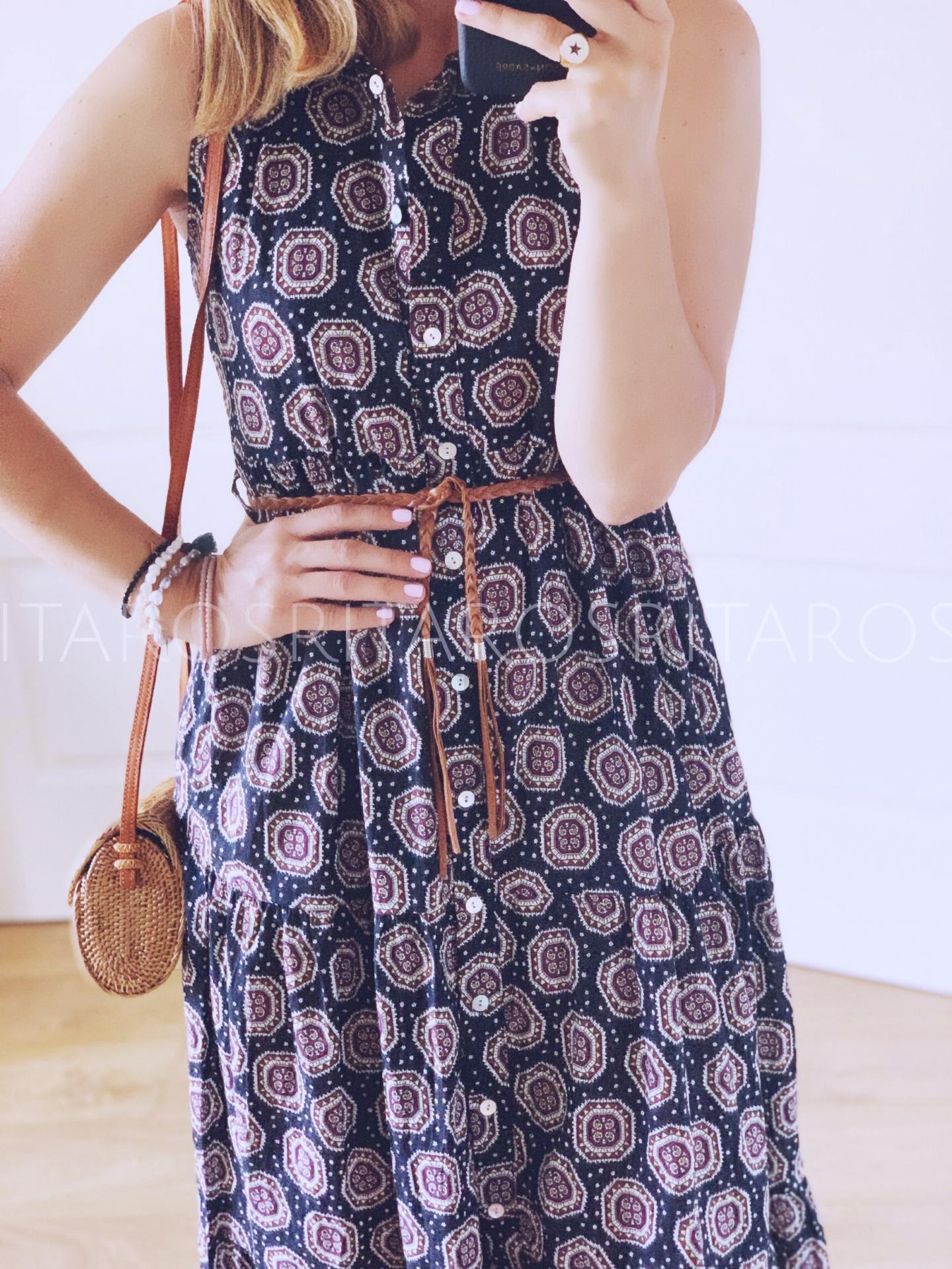 Vestido largo camisero sin mangas abotonado y con cinturón incluído con un estampado monísimo.