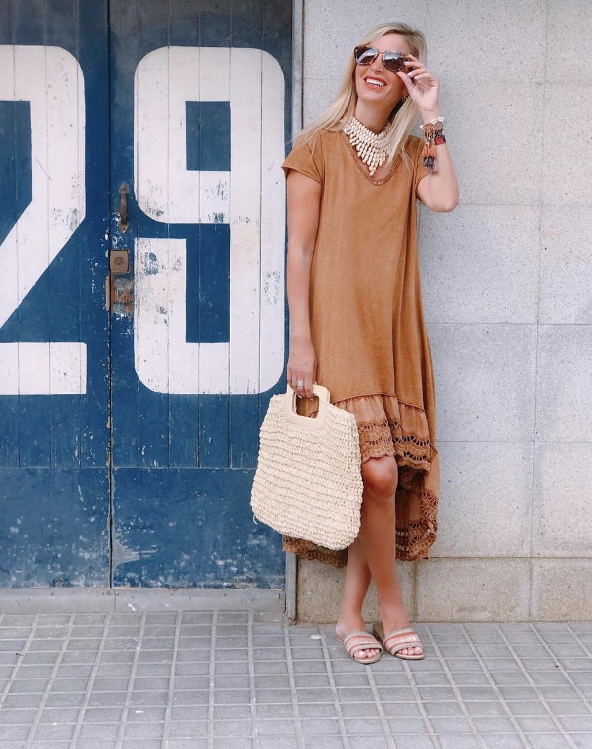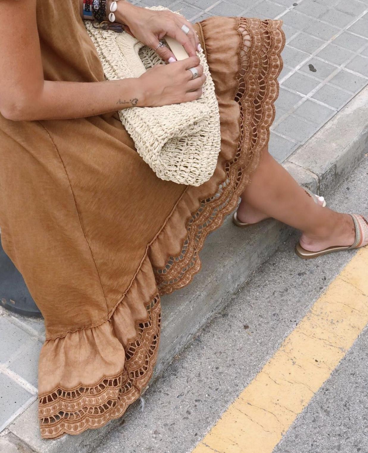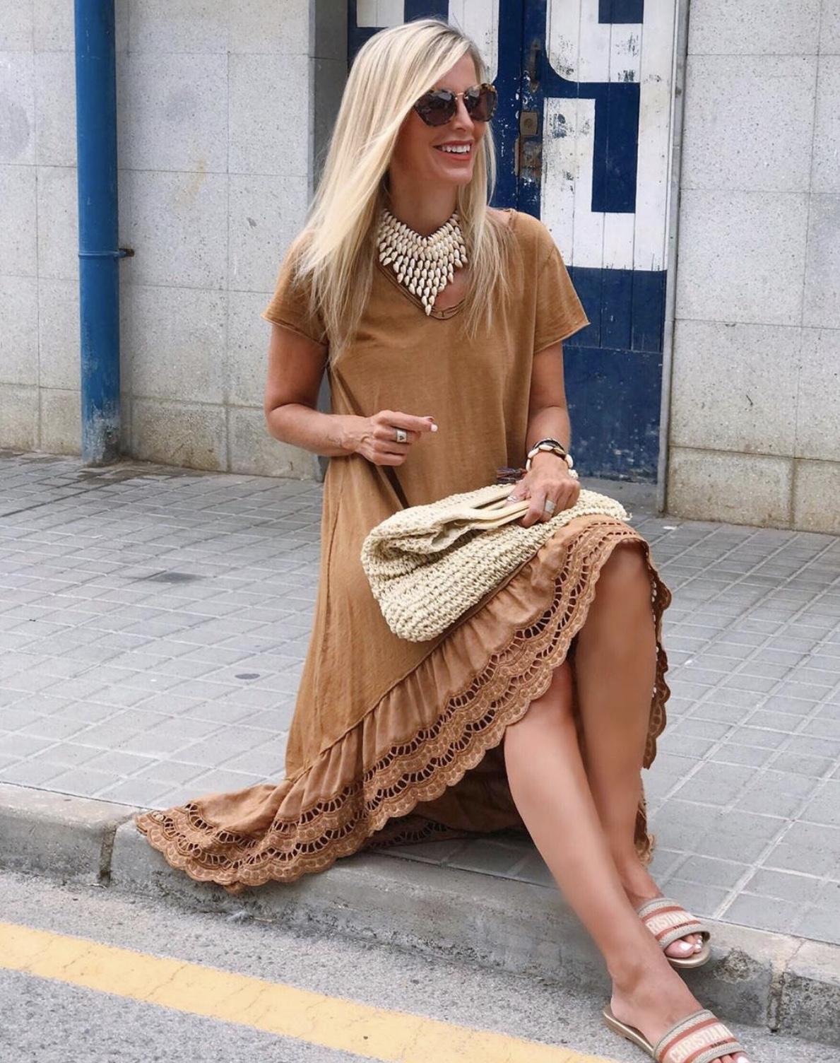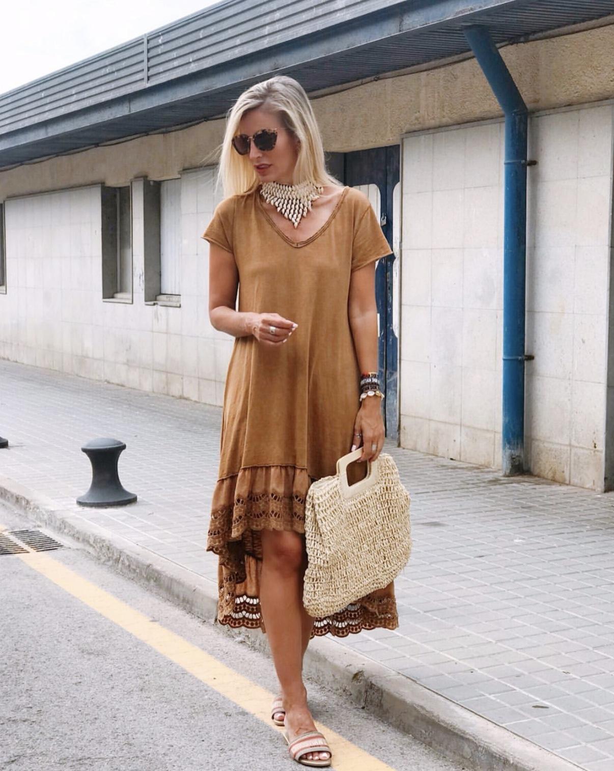 Nuevo vestido de algodón 100% de manga corta con bajo de blonda y corte desigual.
