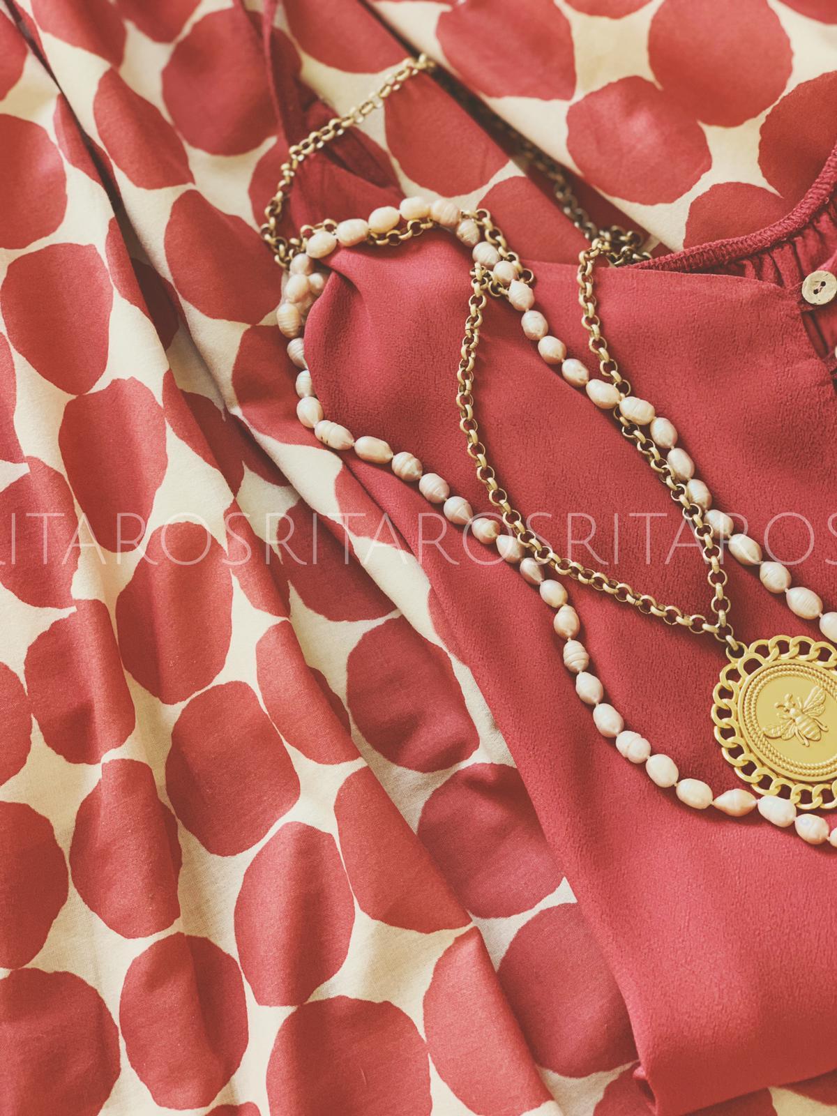 Falda de corte midi con un estampado ideal. La hemos combinado con nuestro top Adda en color teja y la combinación es perfecta.
