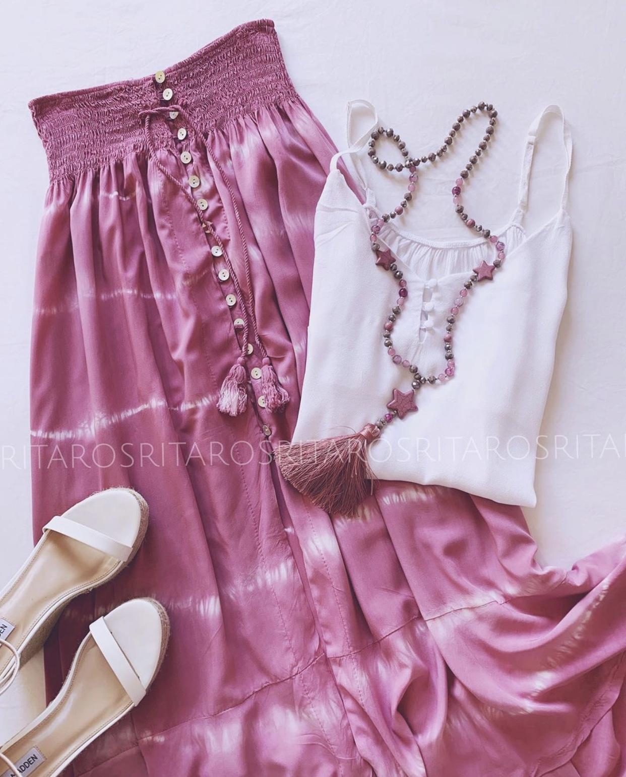 Falda larga estampada estilo Tie Dye con cintura ancha fruncida y detalle botones.
