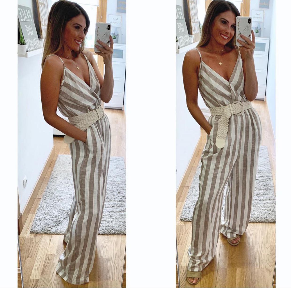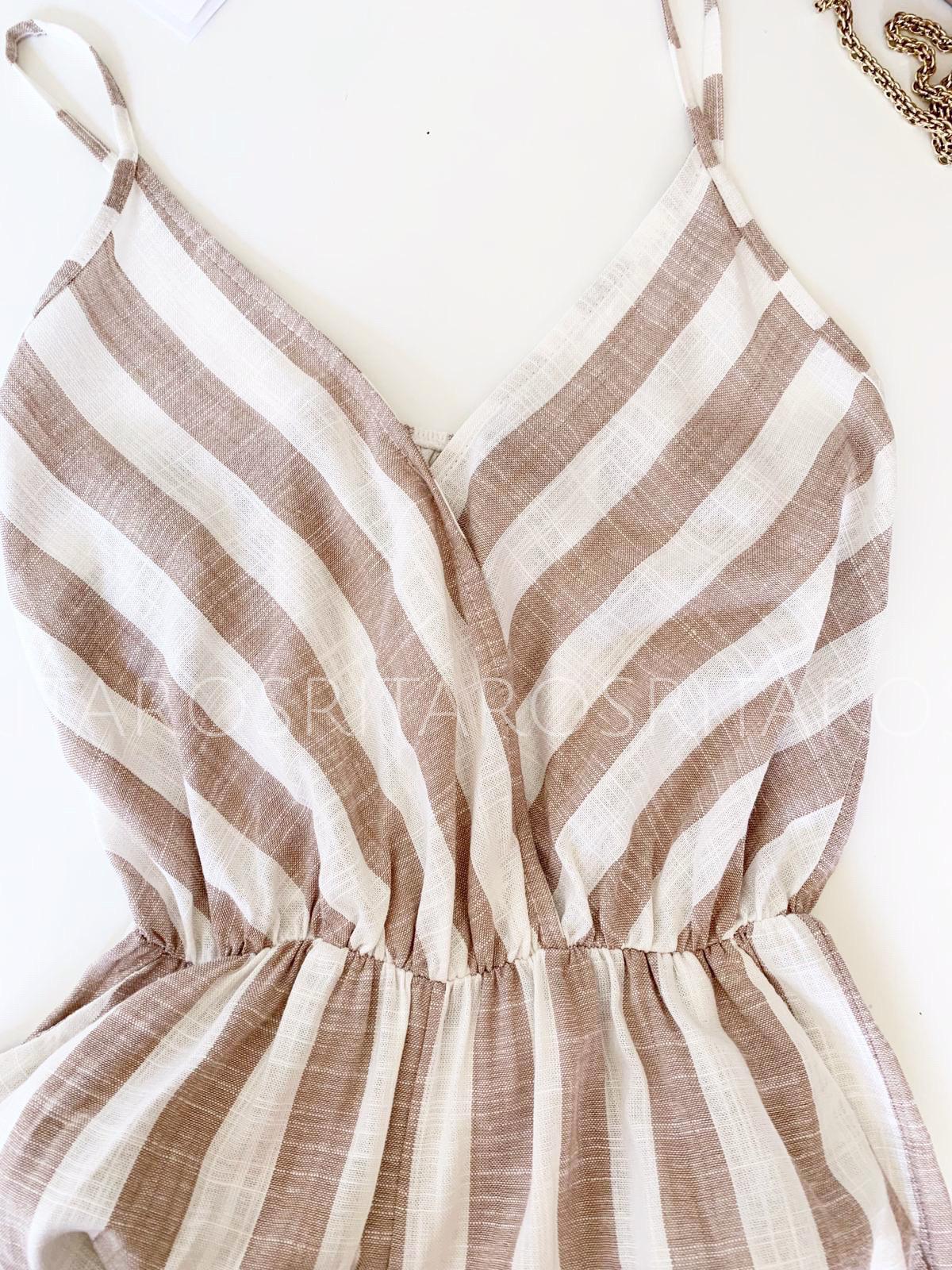 Mono largo estampado de rayas de tirantes finos, escote cruzado(cosido) y cintura con goma fruncida. Bolsillos laterales y espalda con goma fruncida.