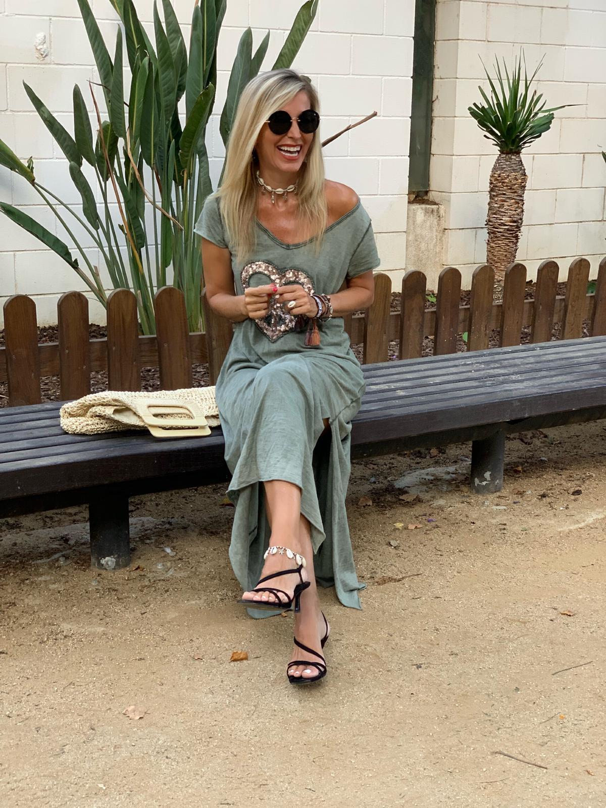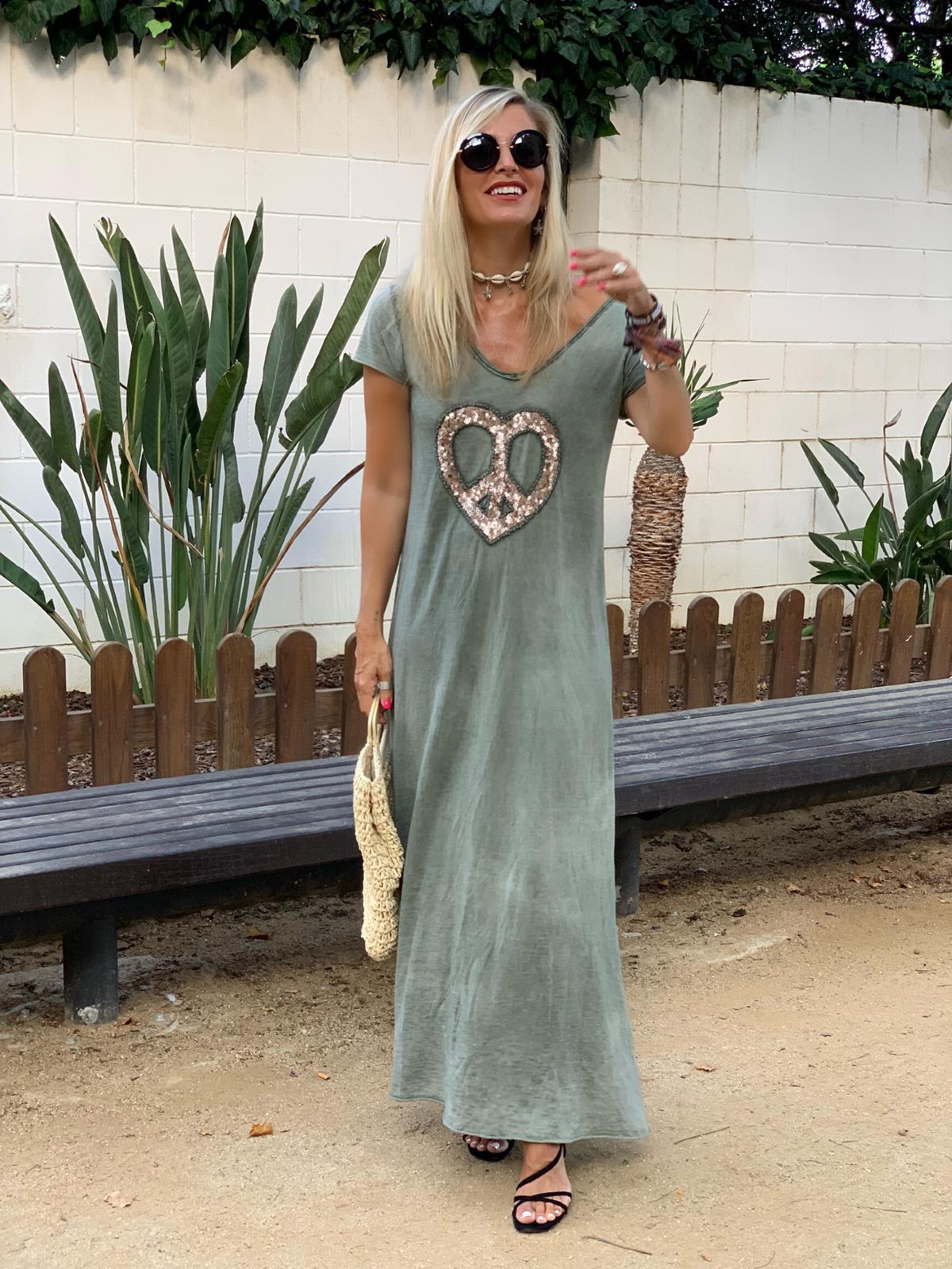 Vestido de algodón largo de manga corta y detalle símbolo con lentejuelas. Una prenda ideal y cómoda para llevar a diario.
