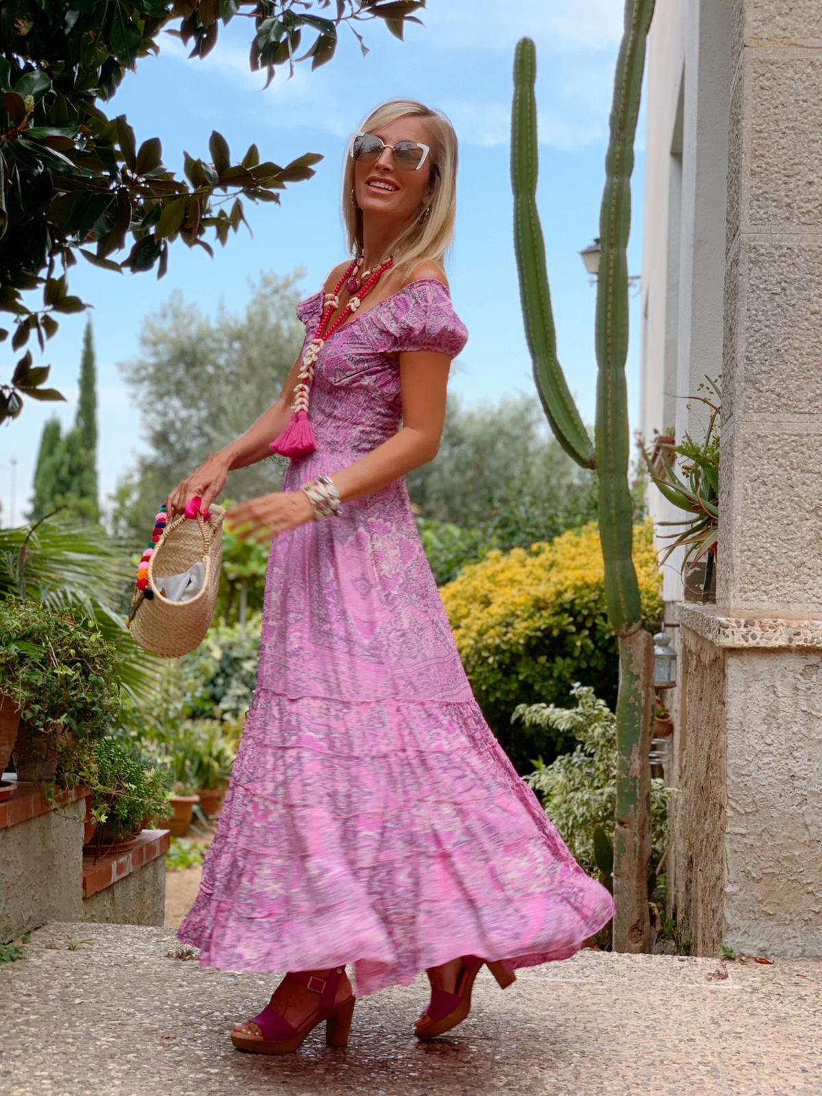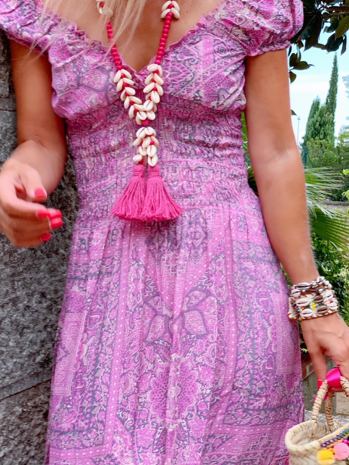 Precioso vestido largo estampado, manga corta, escote en pico y cintura ancha fruncida. Una maravilla de vestido que estiliza muchísimo por el corte y tejido.