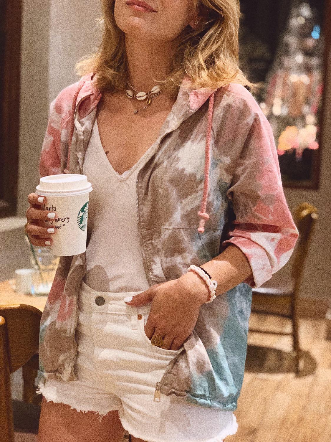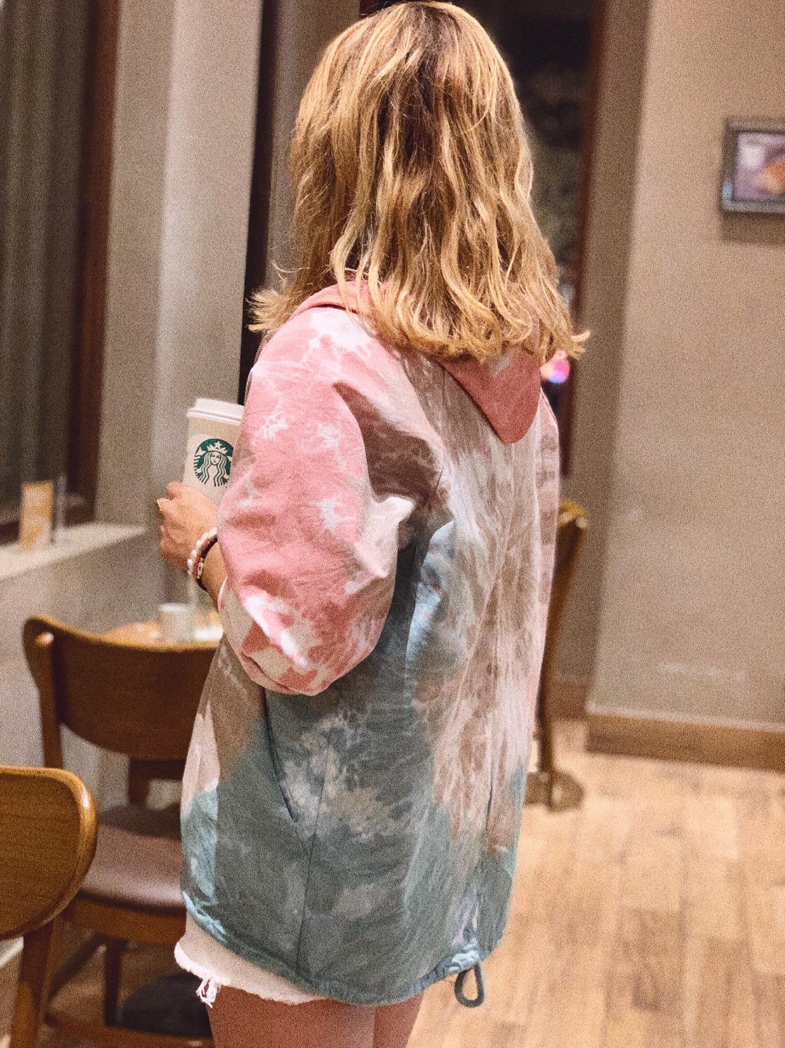 Parka estampada tie dye con capucha y corte recto con bolsillos y cierre frontal con cremallera.