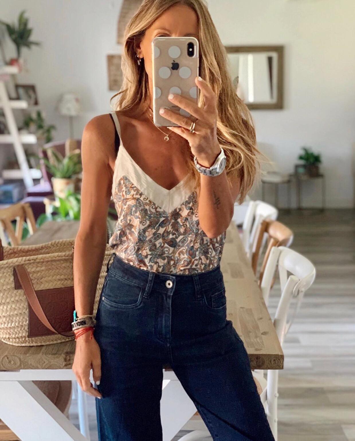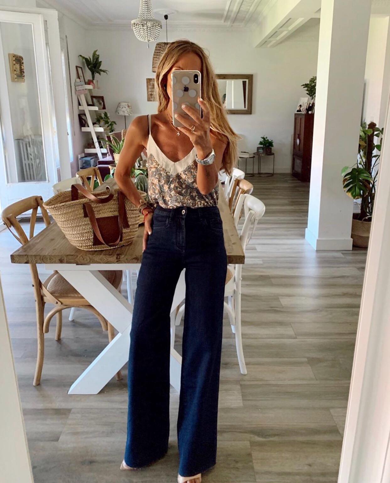 Pantalón vaquero largo de tiro alto, corte ancho y pierna recta con 5 bolsillos.
