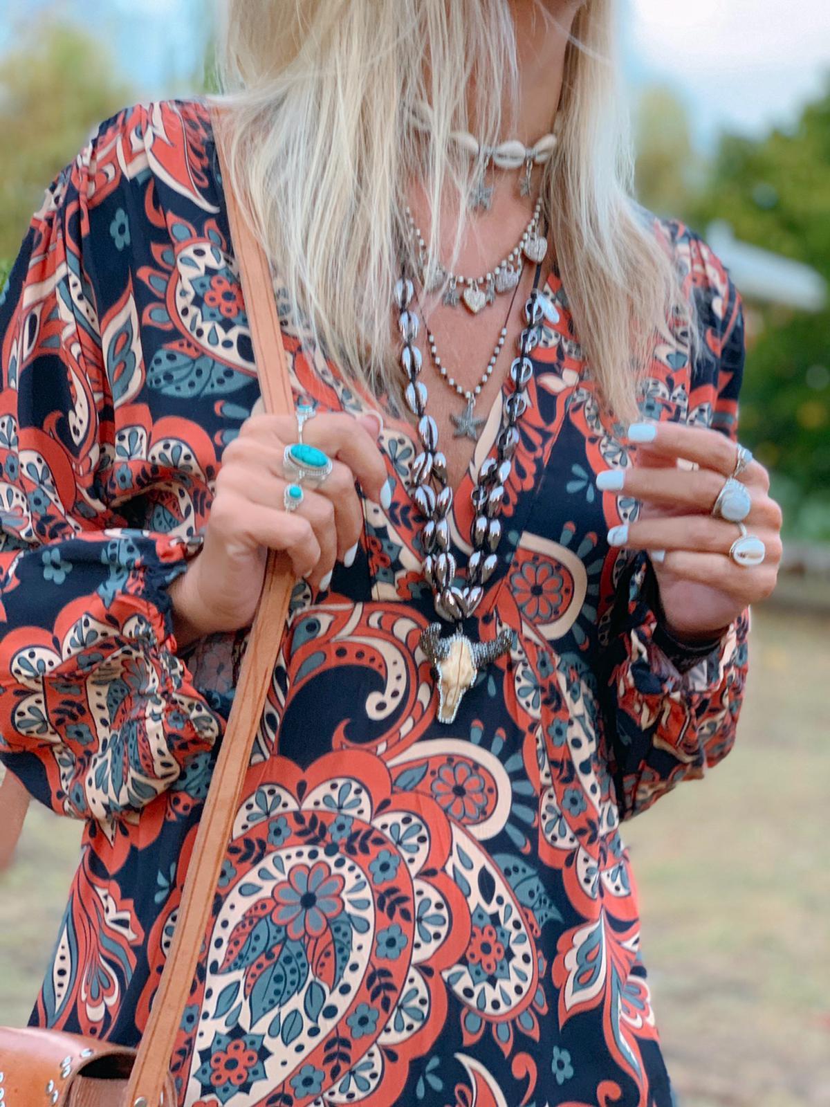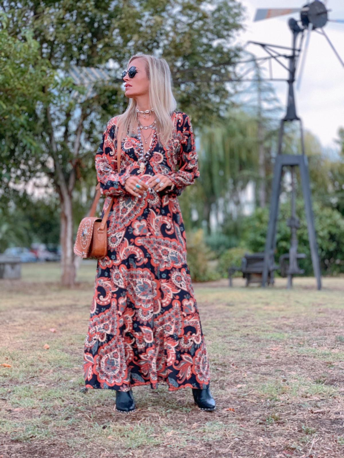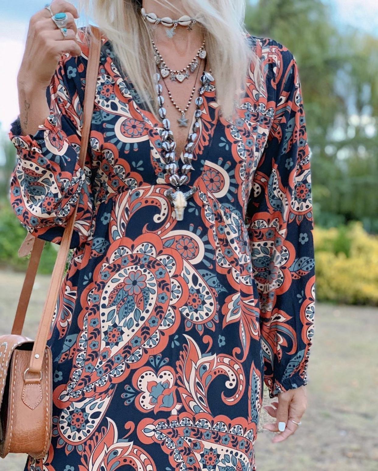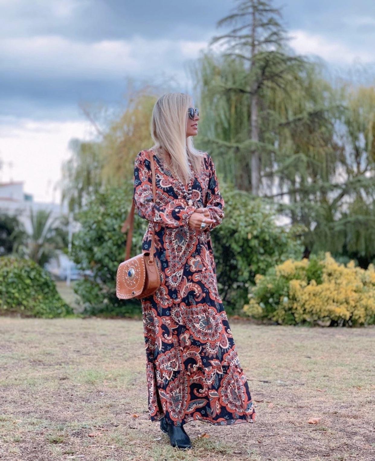 Vestido largo oversize con un estampado de estilo setentero precioso. Manga larga con puños fruncidos. Un vestido comodísimo de total tendencia que podrás combinar con botines o con sandalias.