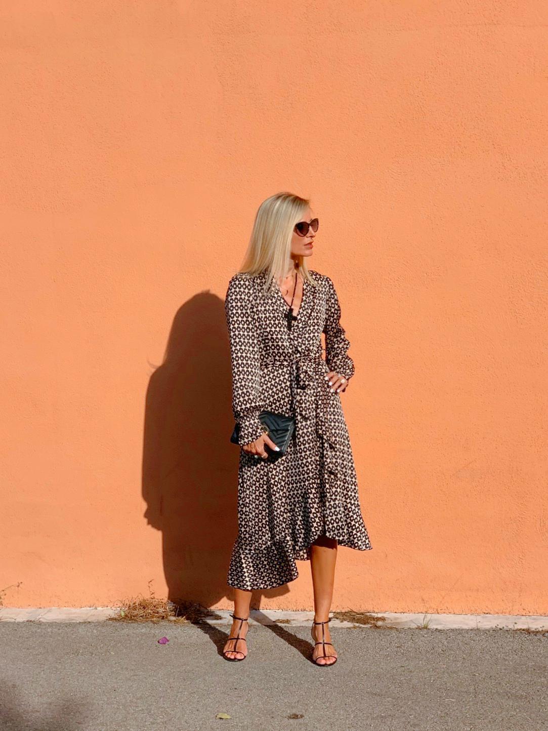 Vestido cruzado de corte midi con un estampado precioso. Manga larga con puño de camisa y cinturón del mismo tejido. Bajo irregular con volante.