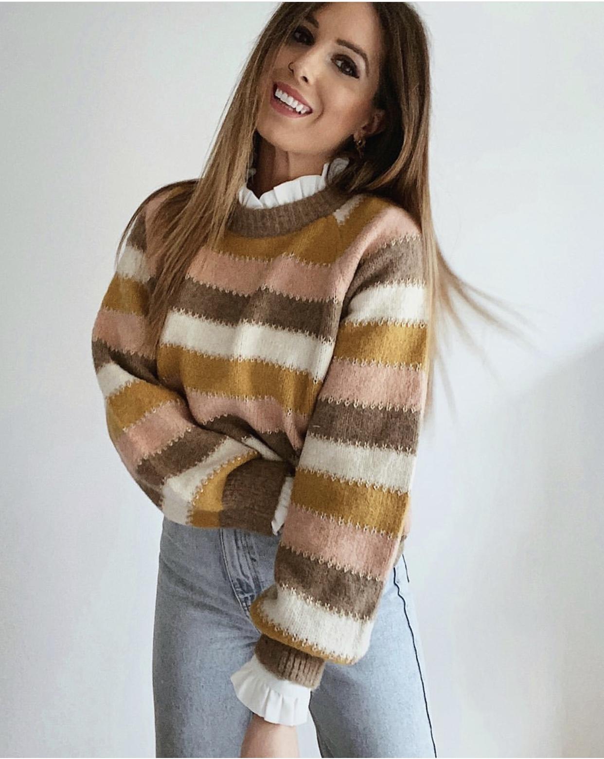 Jersey de punto grueso, manga larga y cuello redondo con una combinación preciosa de colores.