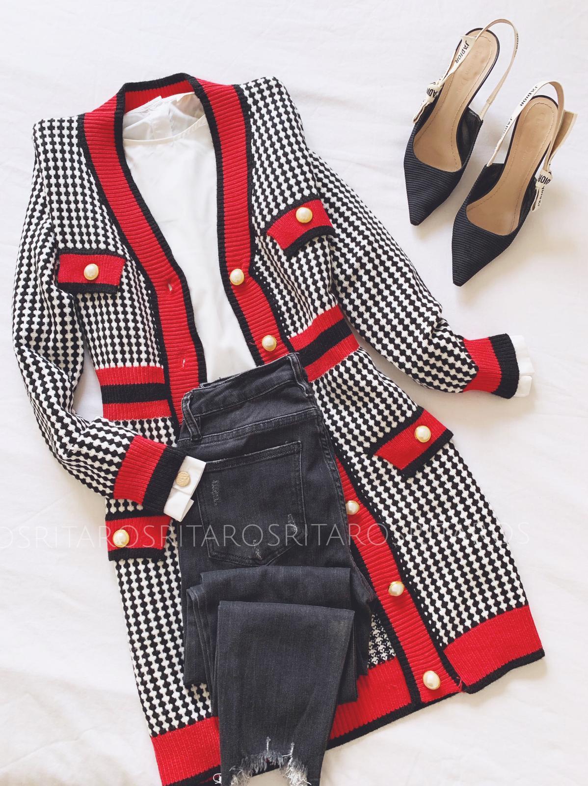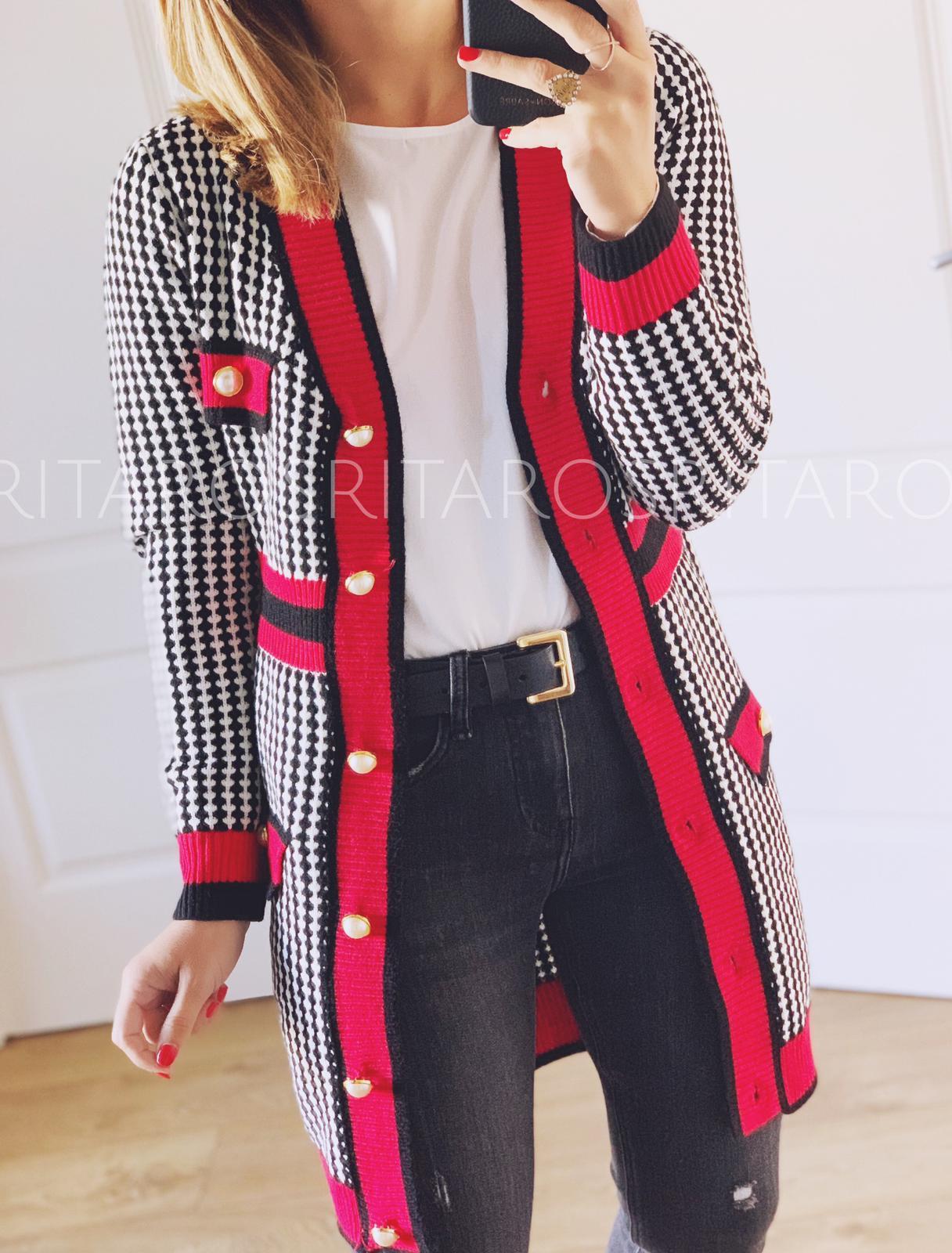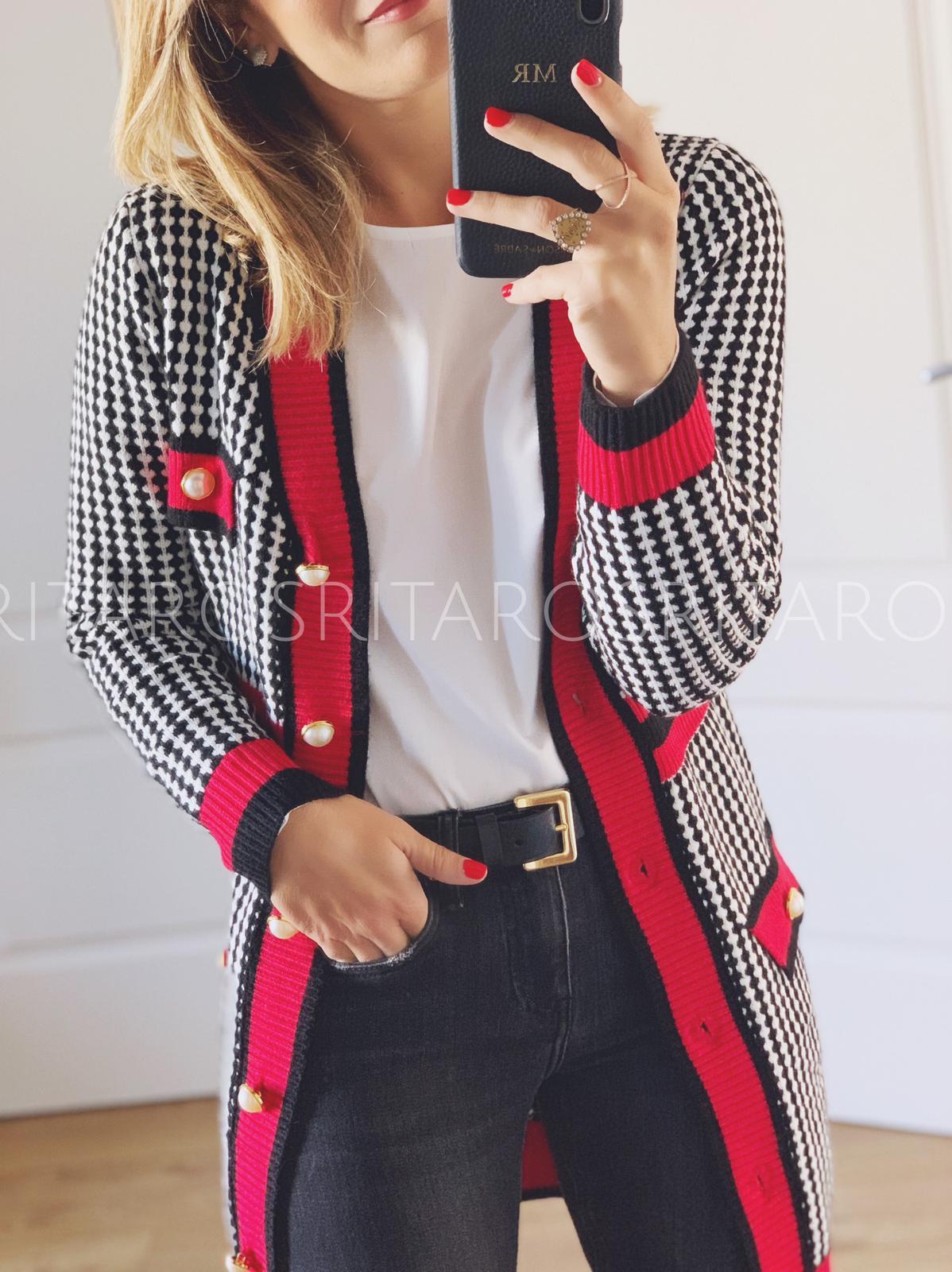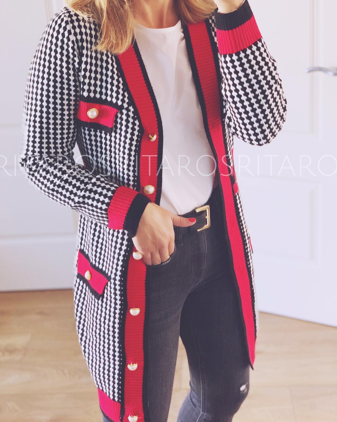 Chaqueta larga de punto de pata de gallo combinado con rojo con detalle botones dorados.