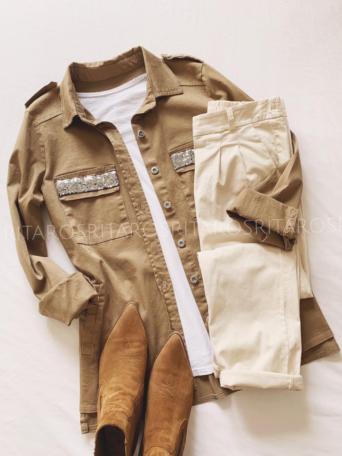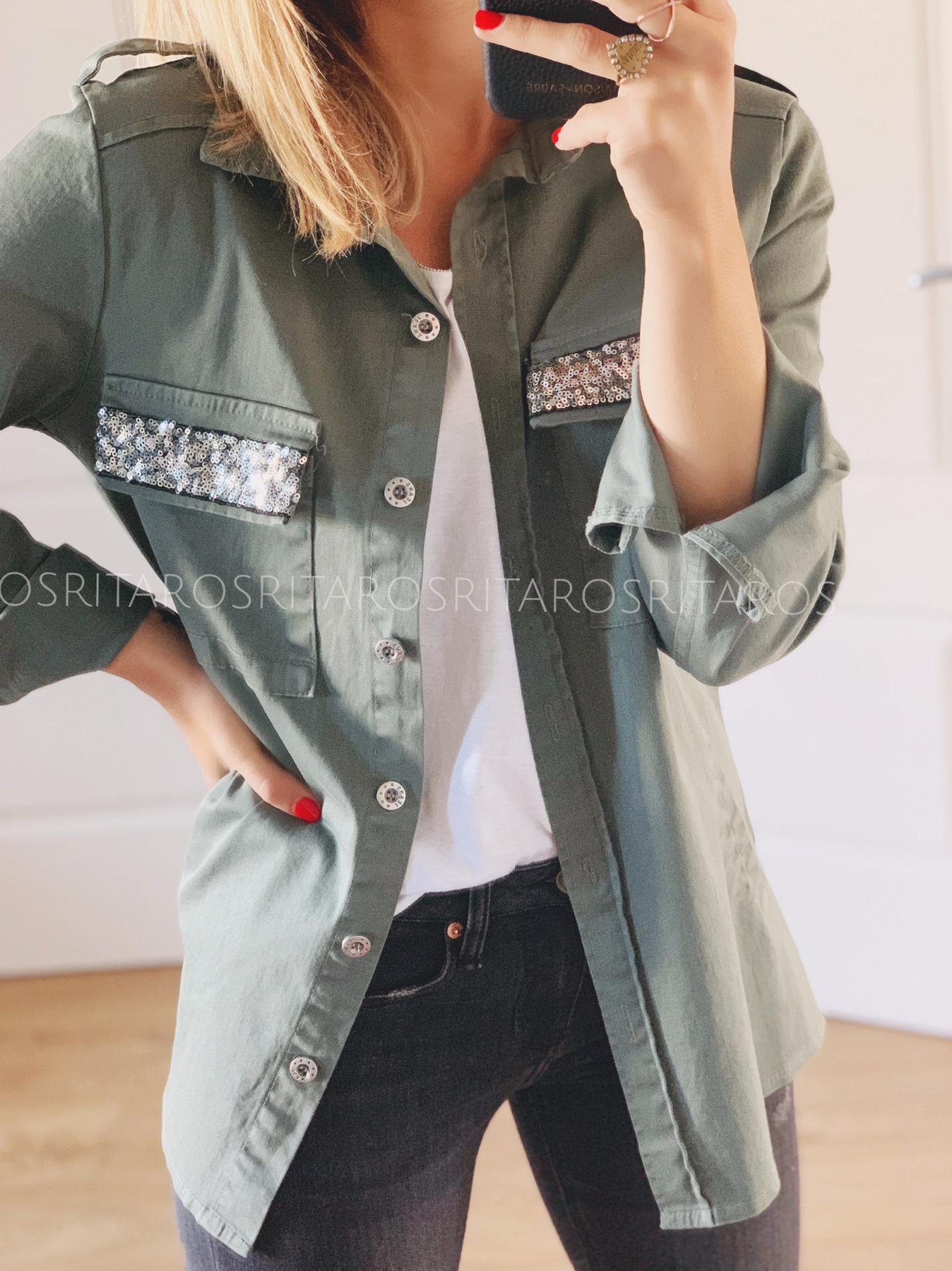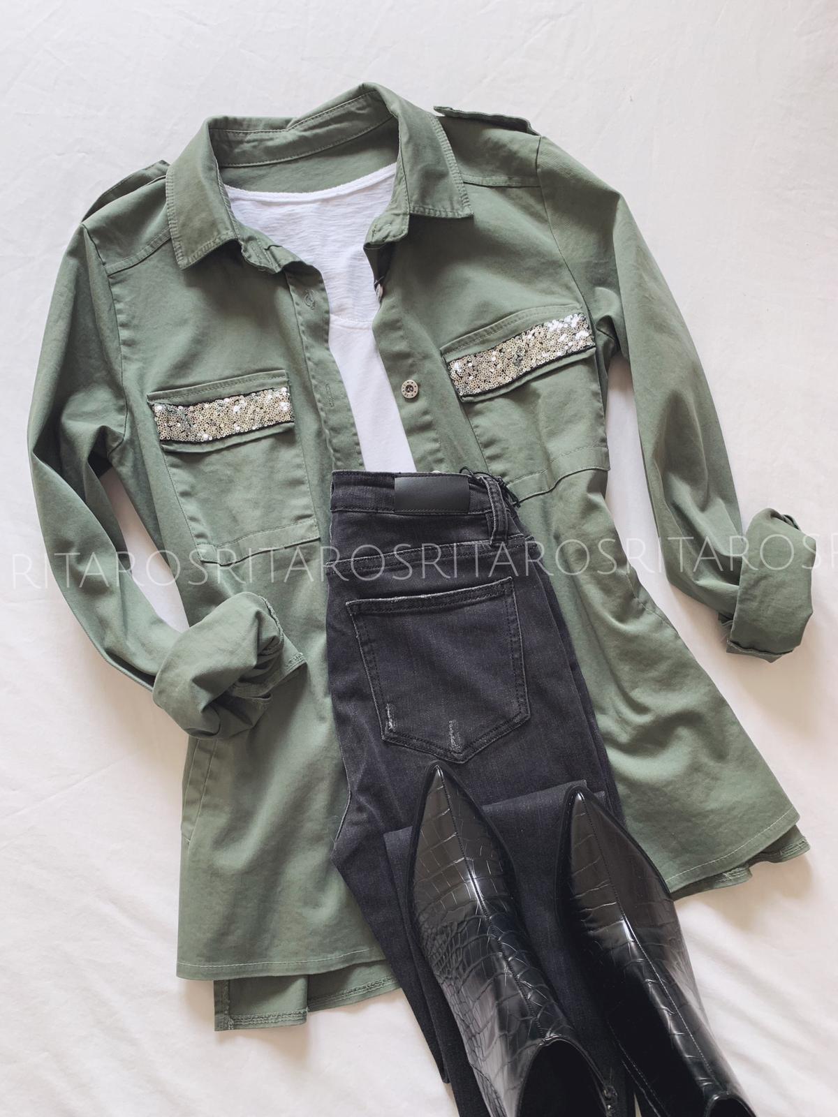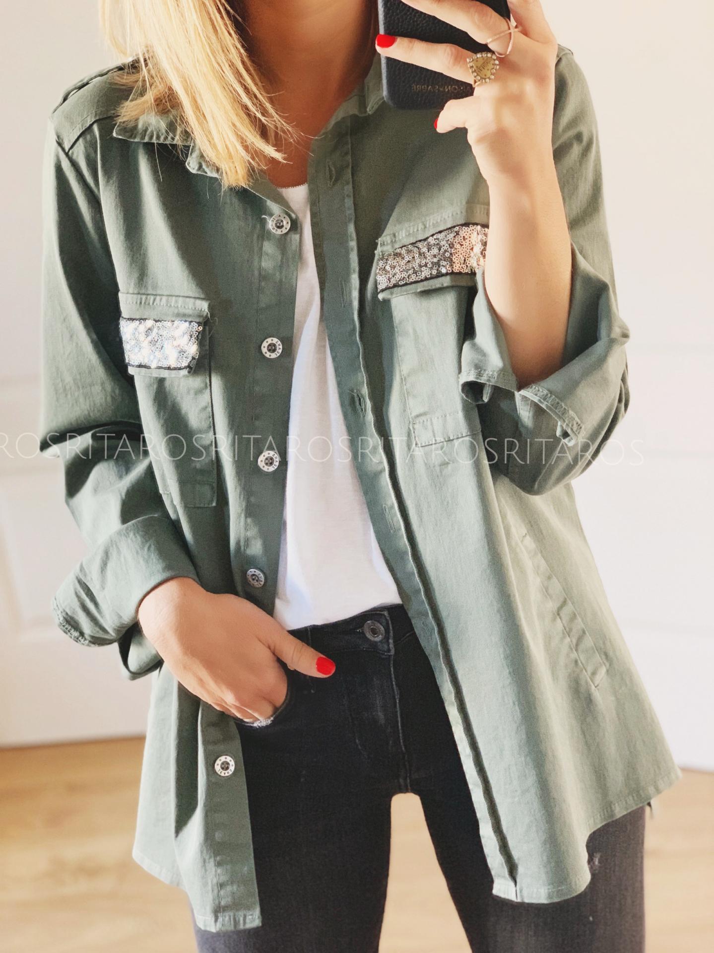Sobrecamisa de manga larga, corte recto y bolsillos con detalle lentejuelas. Tiene elástico.