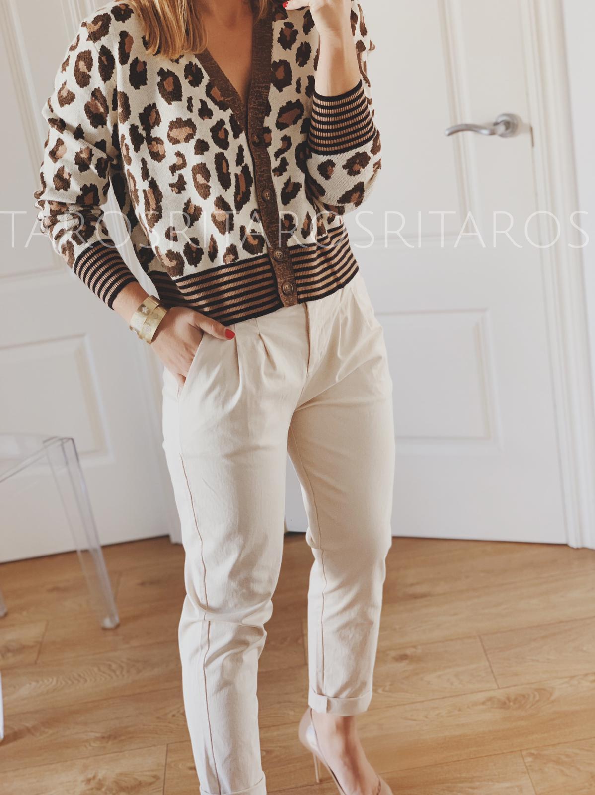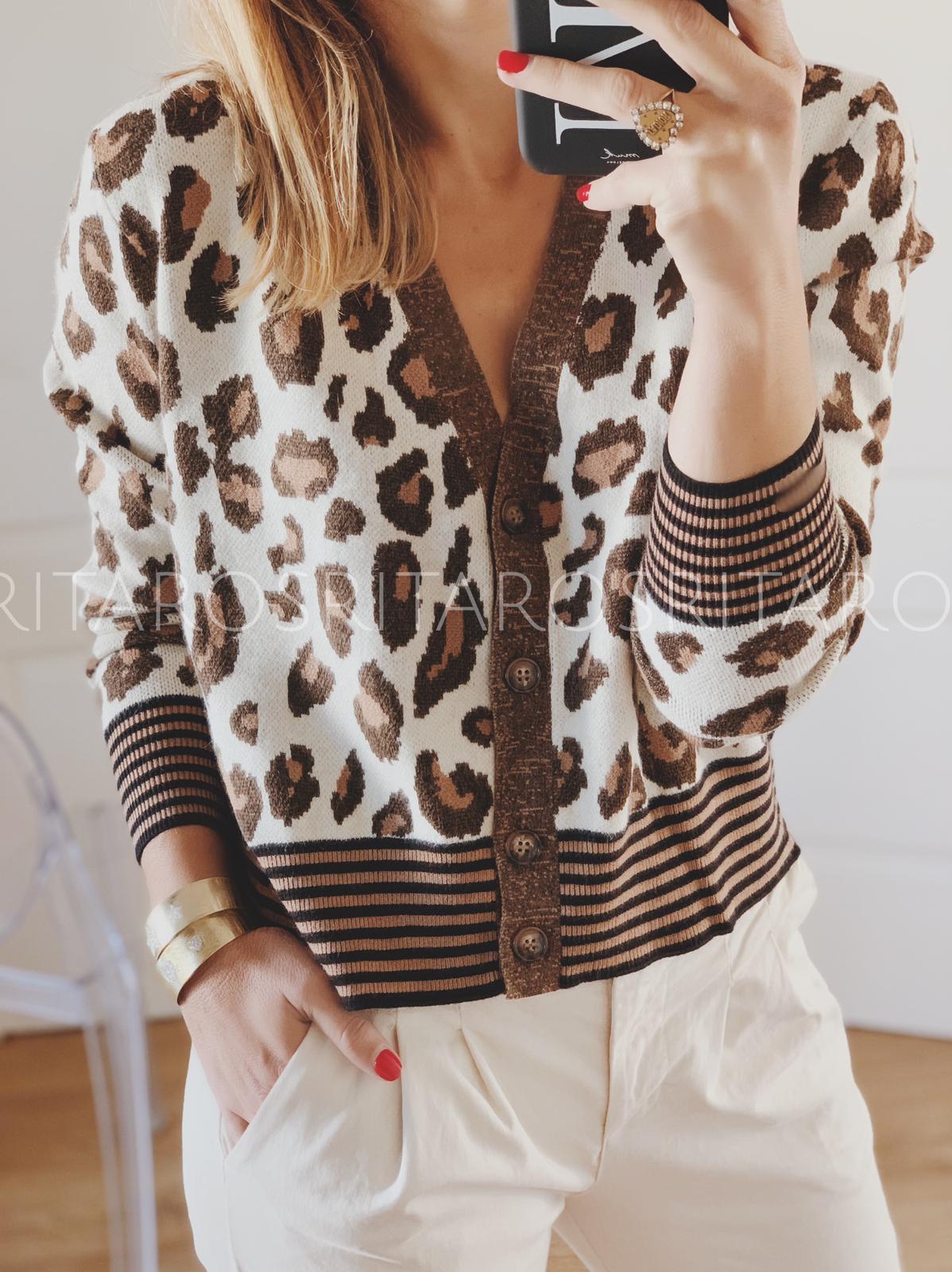 Chaqueta de punto efecto animal print con cintura y puños estampado de rayas. Combínala con nuestro pantalón Malibú tanto en color Beige como en Camel y te encantará la combinación.