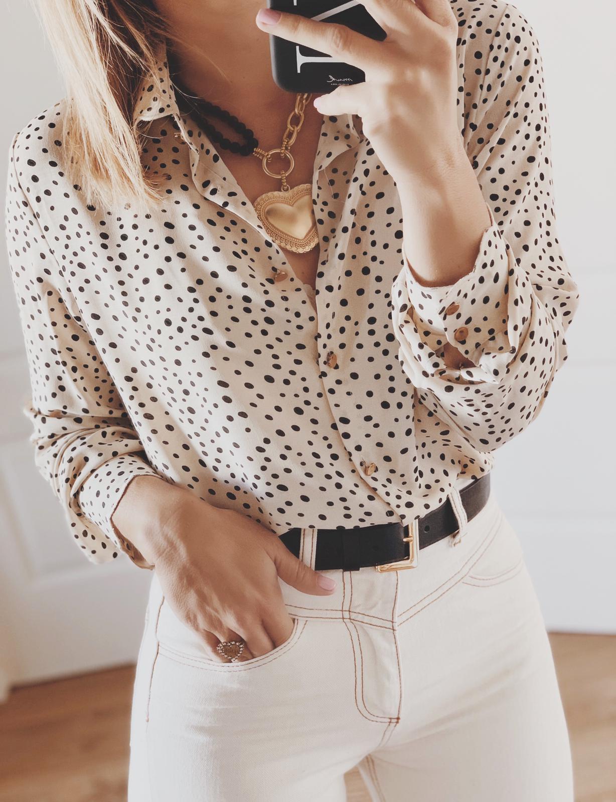Blusa de maga larga estampada con detalle solapa y puños troquelados.