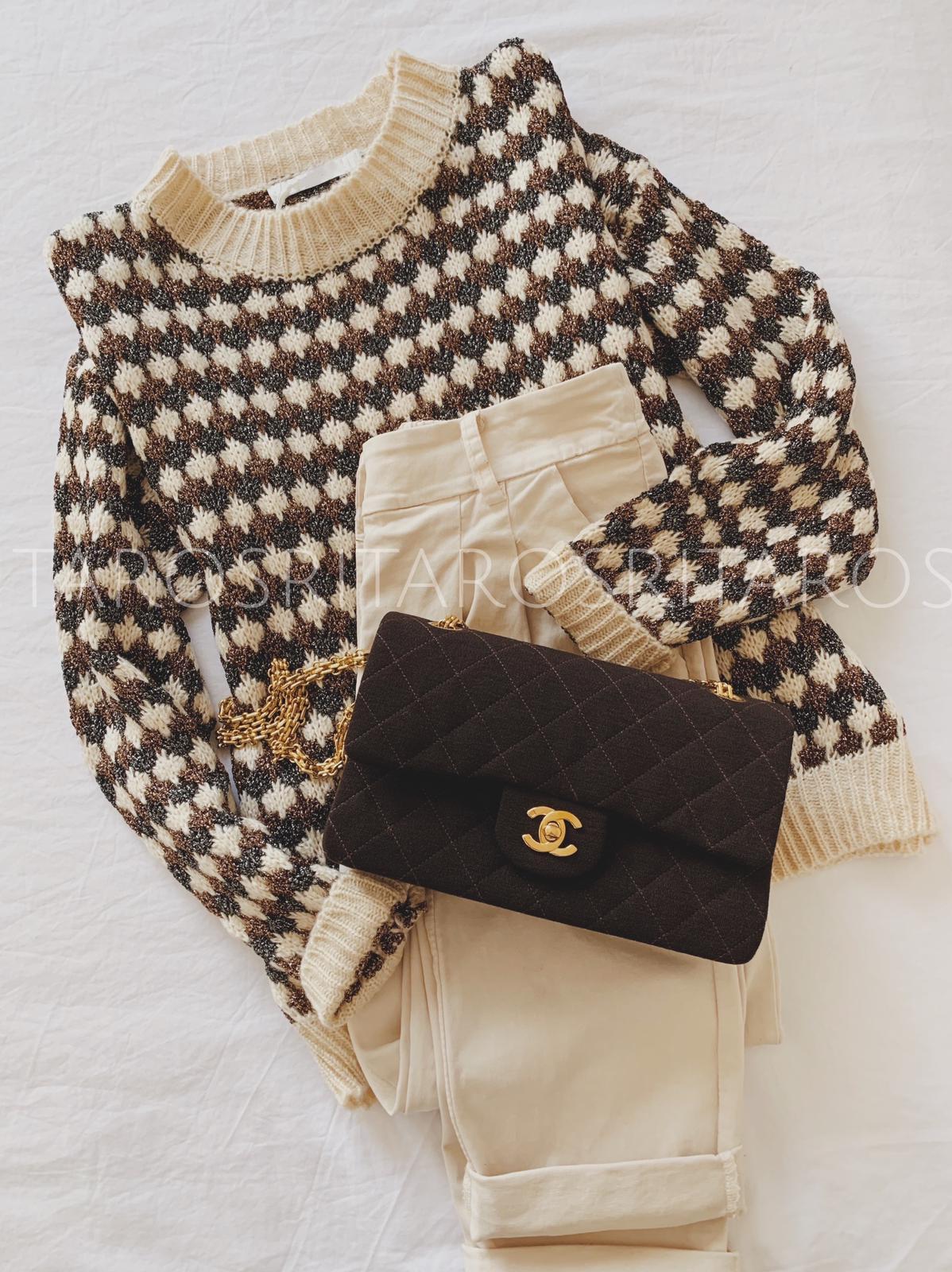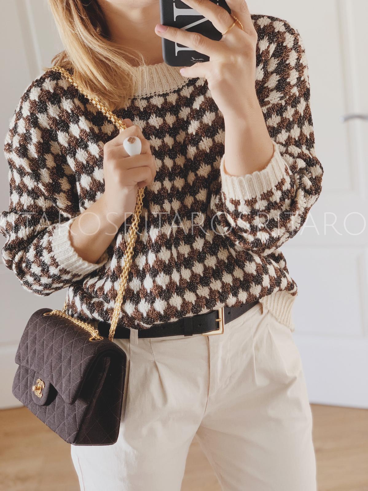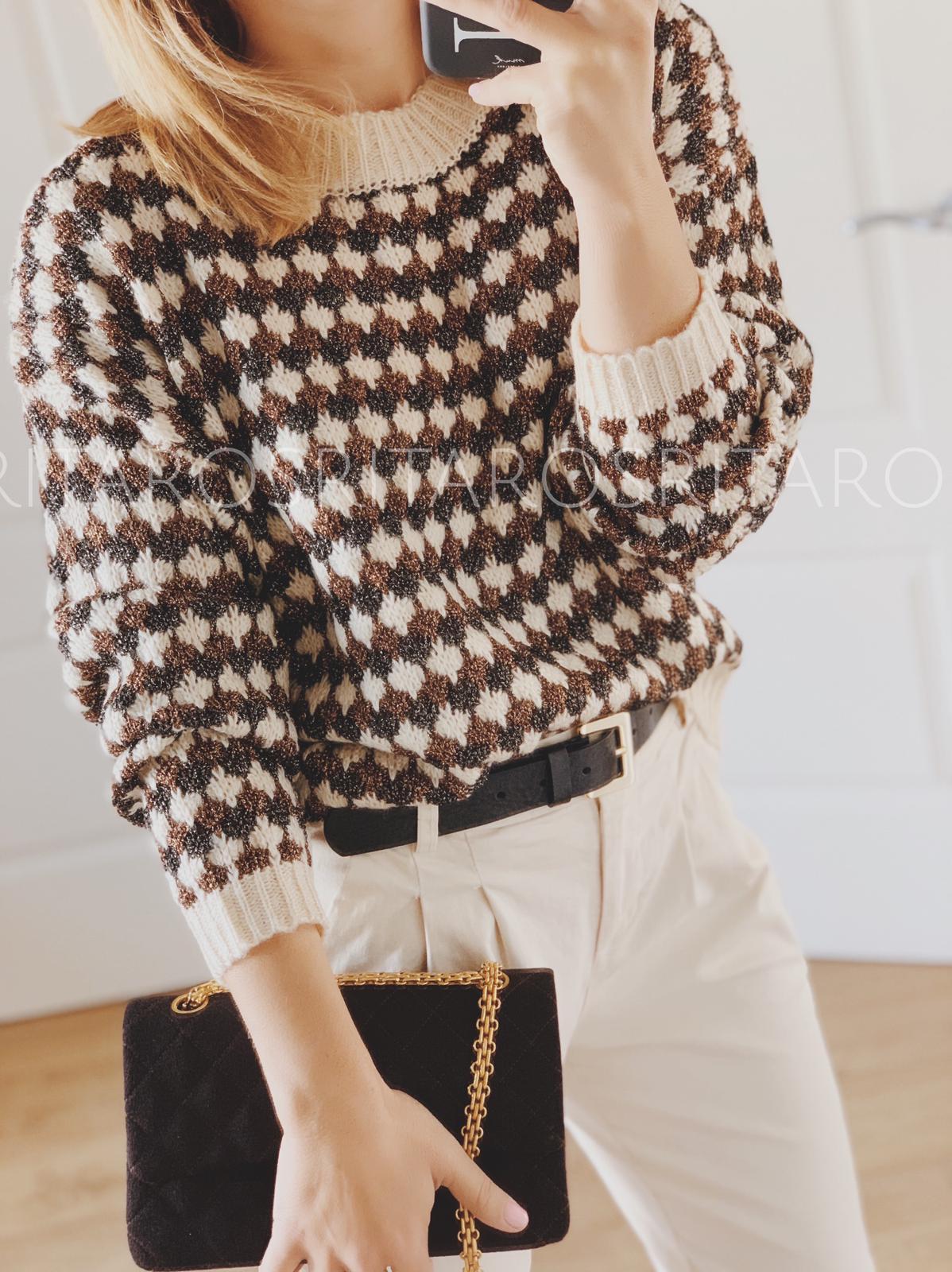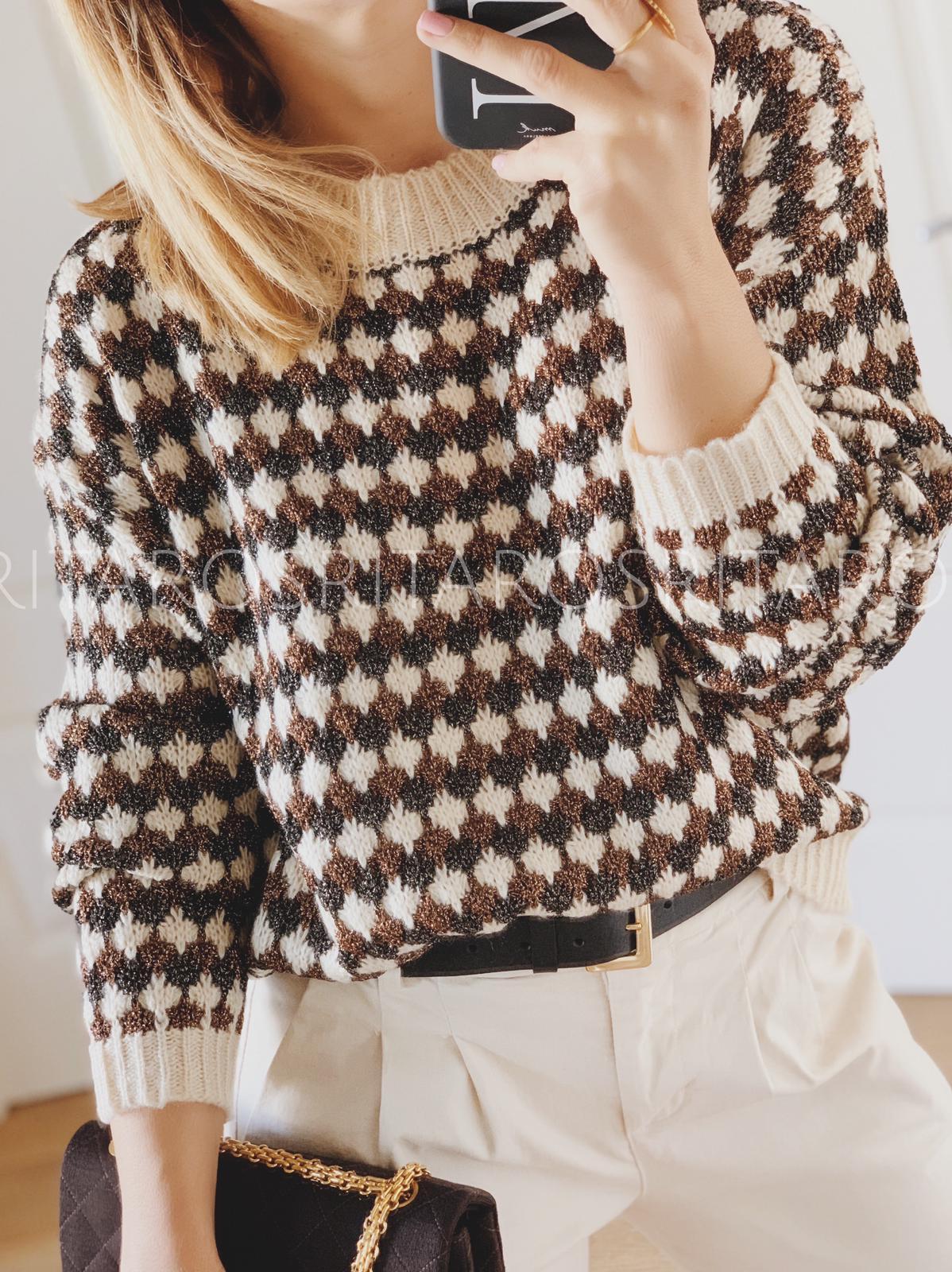 Jersey de punto de manga larga y escote redondo con detalles glitter en marrón y negro.