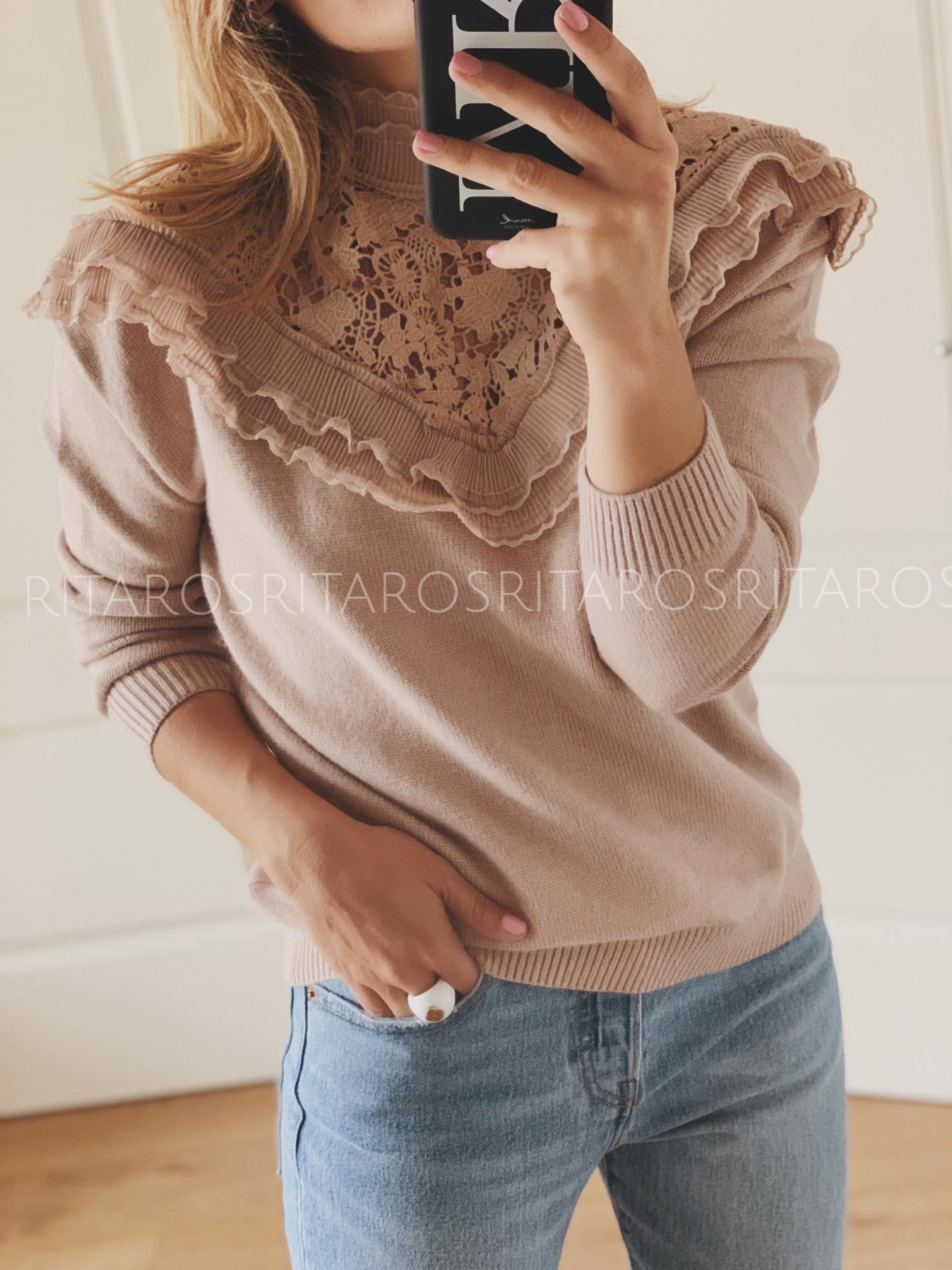Jersey de manga larga con detalle encaje en frontal y cuello subido. Una prenda preciosa llena de detalles con un tejido que te encantará. Combínalo con unos jeans y te encantará el resulatdo.