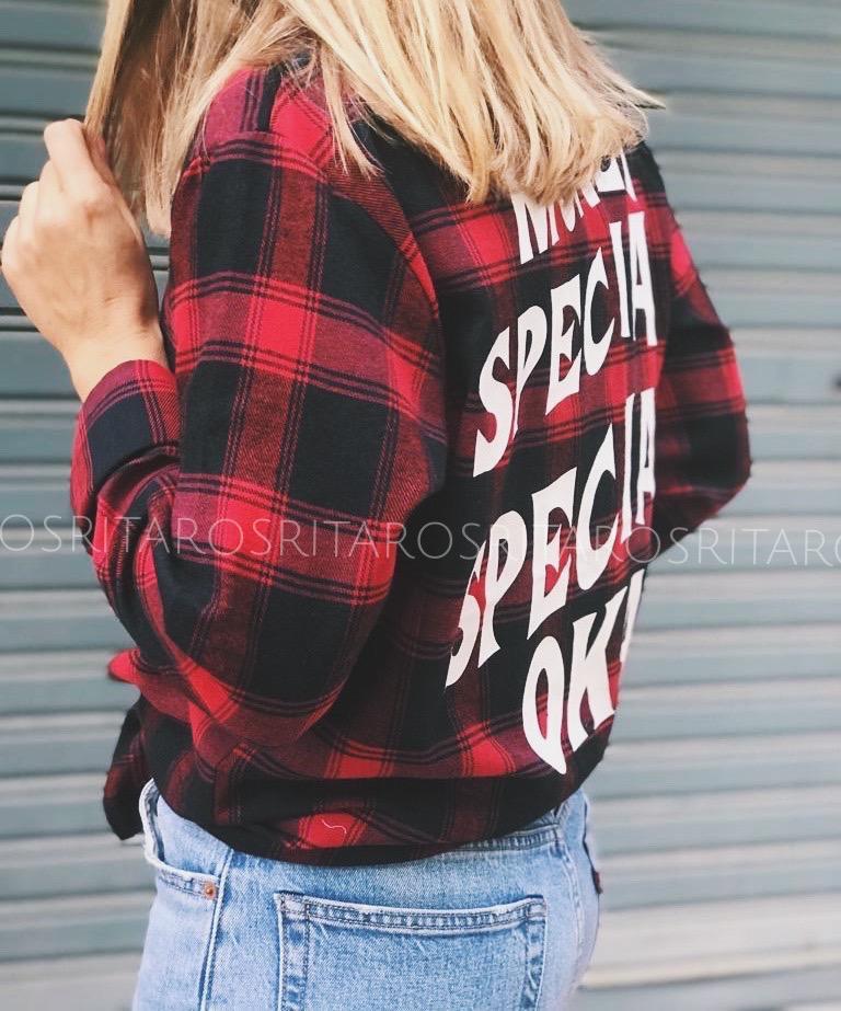 Camisa de manga larga estampada de cuadros con mensaje en la espalda. Combínalo con unos jeans y unos botines y te encantará el resultado.