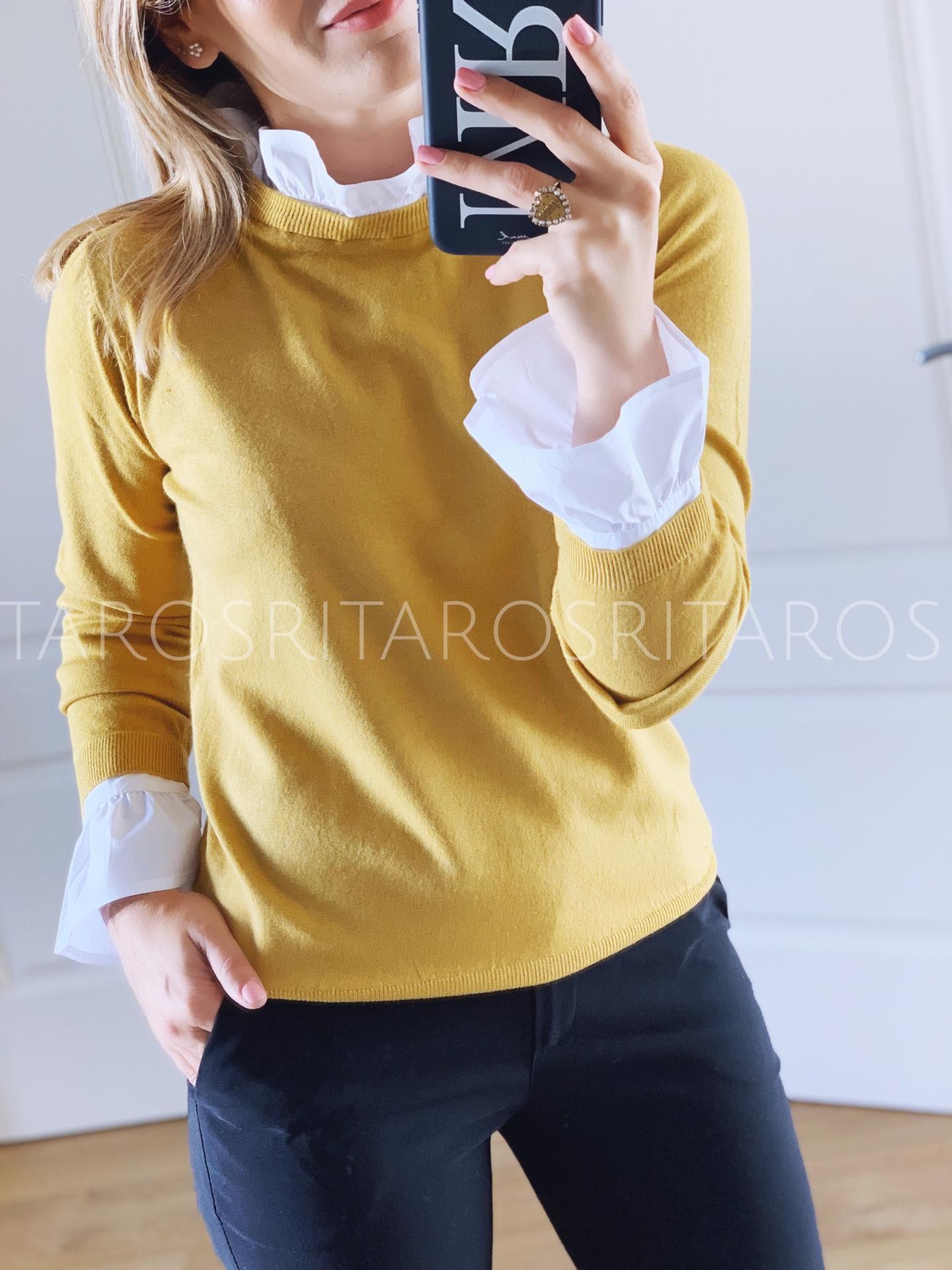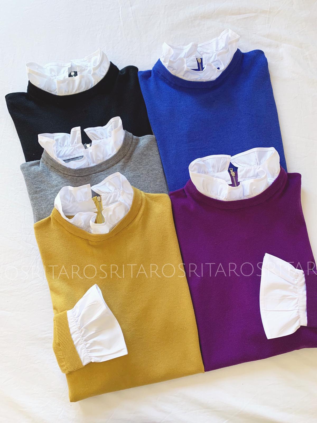 Jersey de punto fino con cuello y puños de blusa incluídos. El tejido es una maravilla.