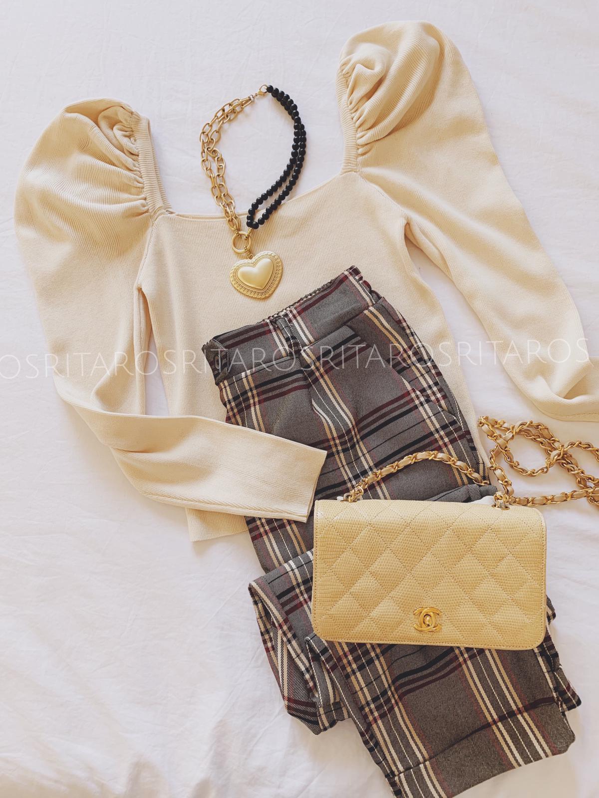 Pantalón largo estampado de cuadros. Cintura con goma elástica por detrás y bolsillos frontales.
