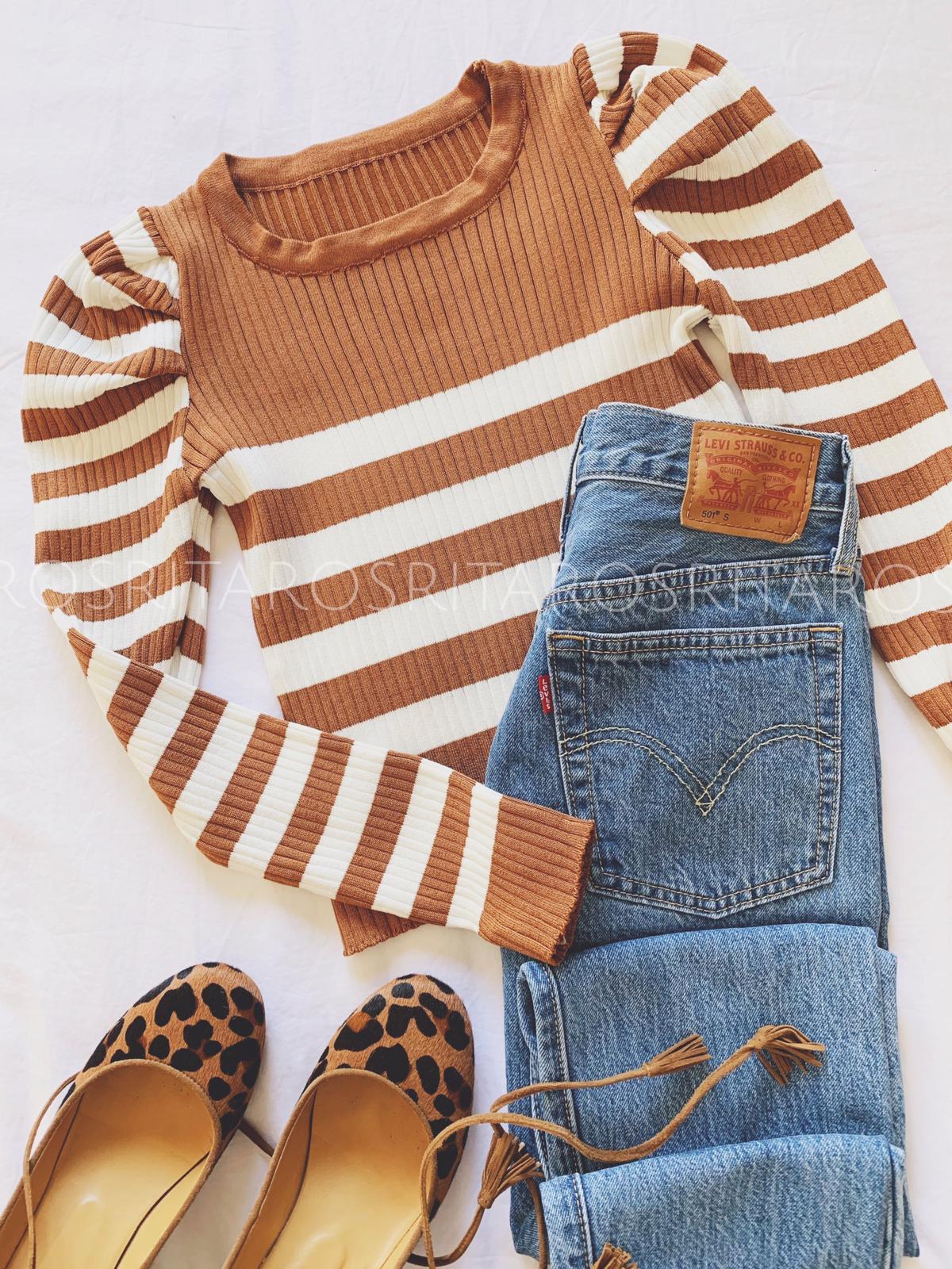 Jersey de punto de canalé con las mangas abullonadas estampado de rayas.