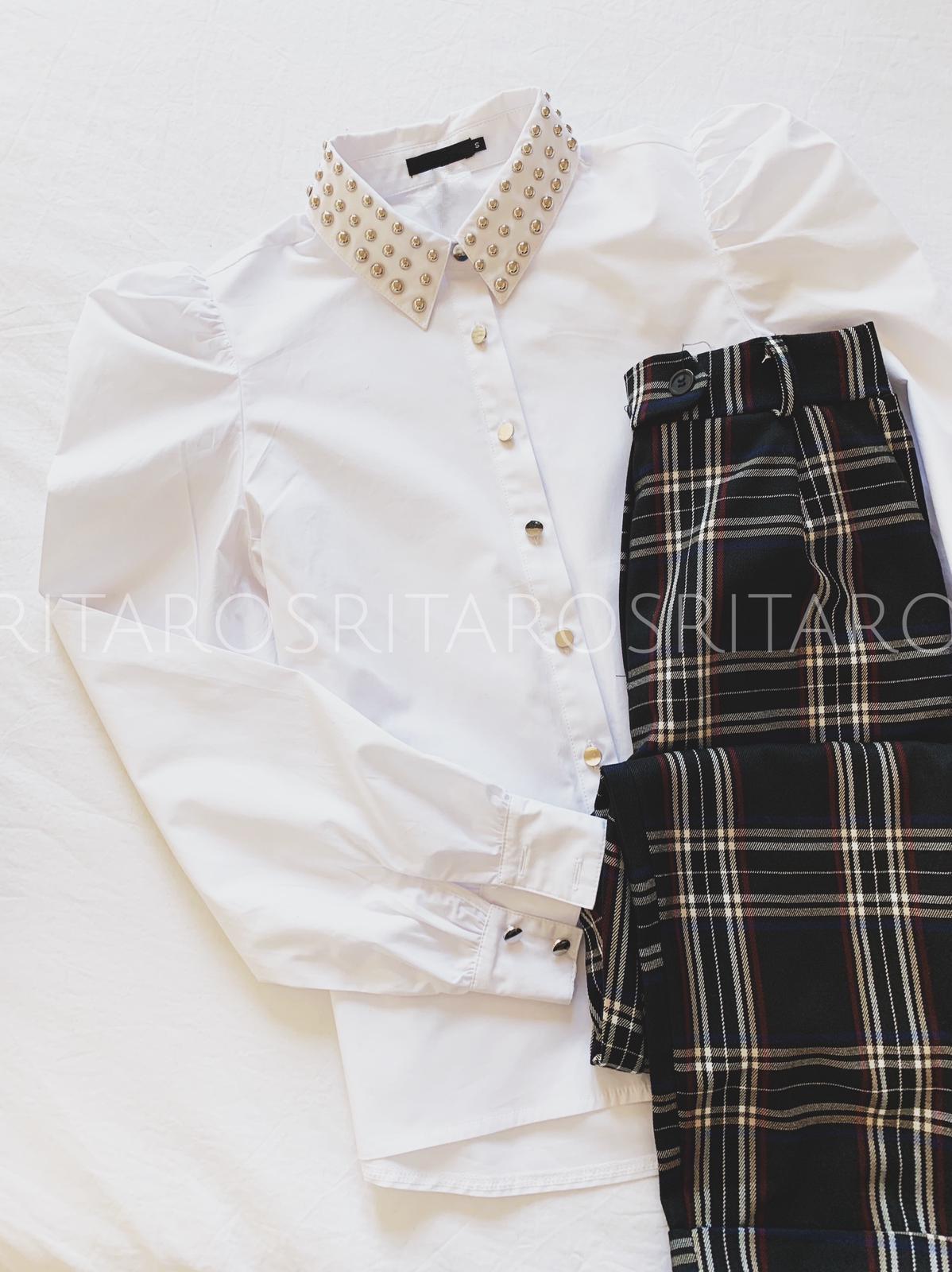 Una preciosidad de camisa de algodón con cuello y solapa, mangas abullonadas y detalle tachuelas en cuello.