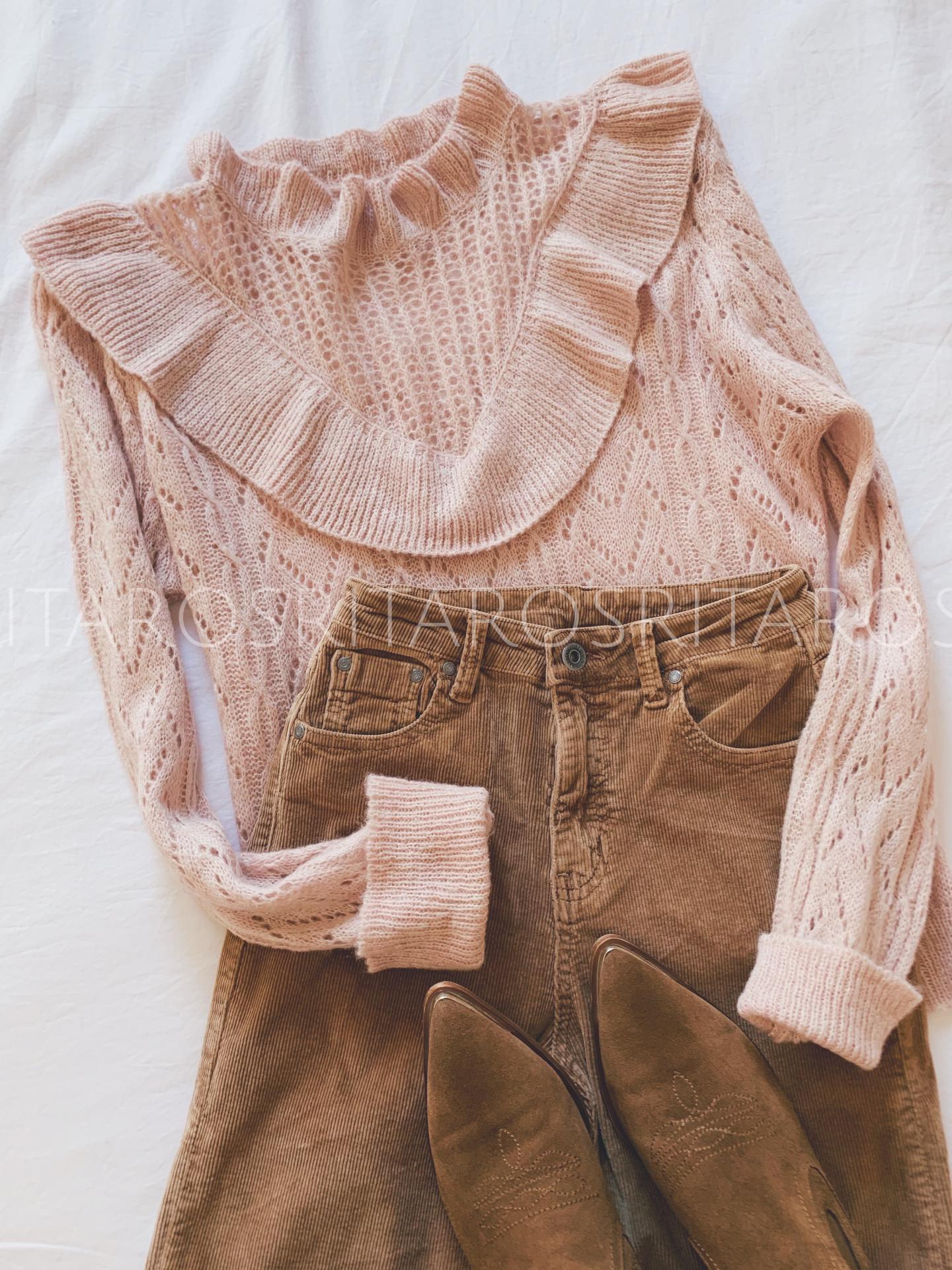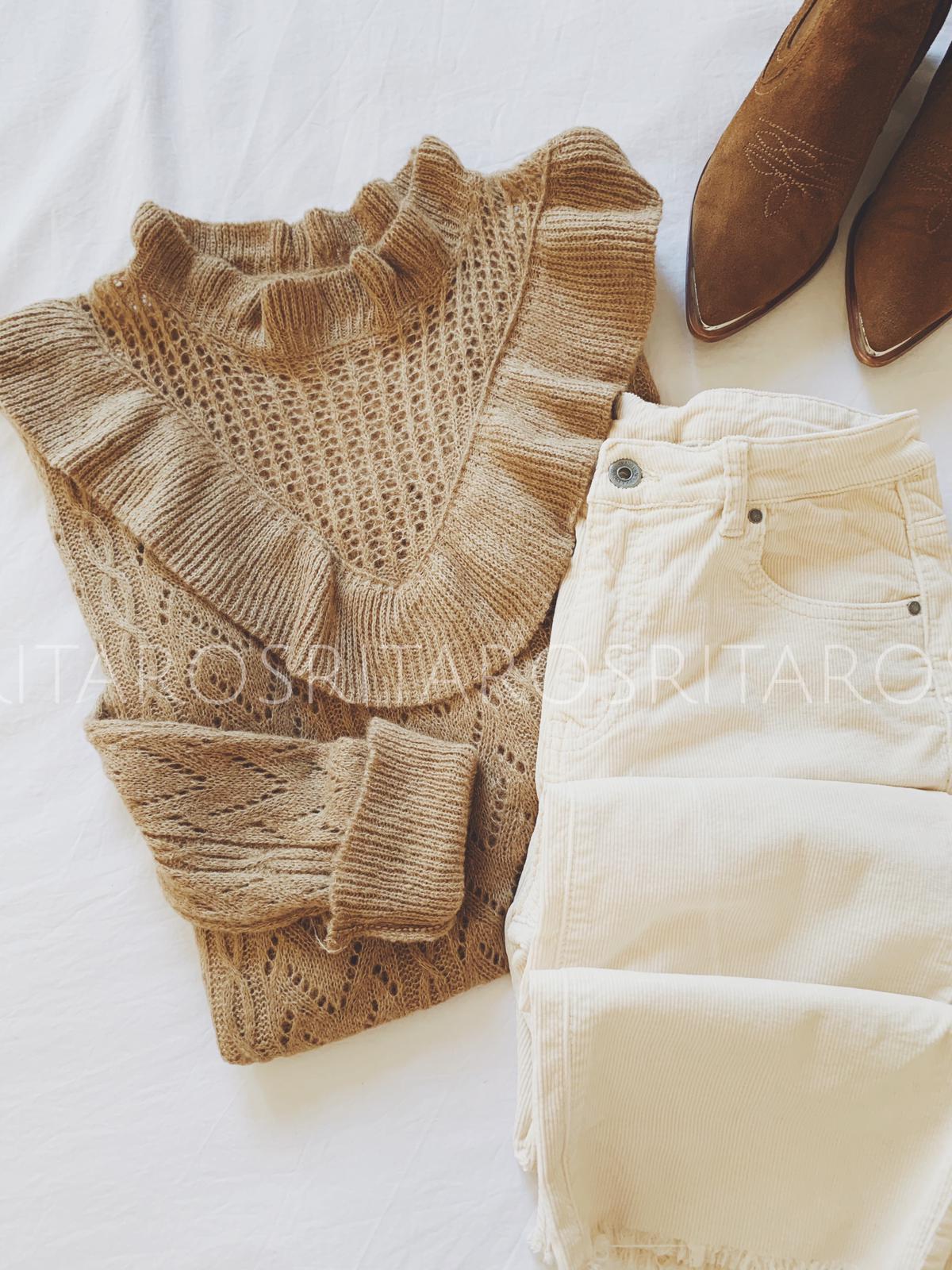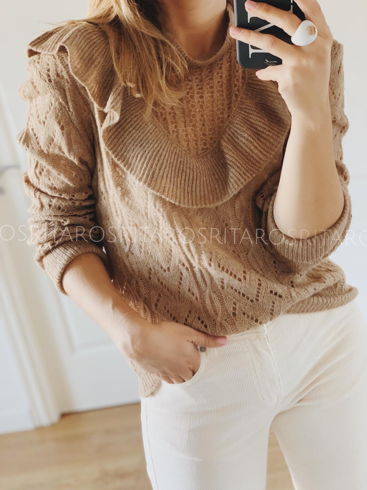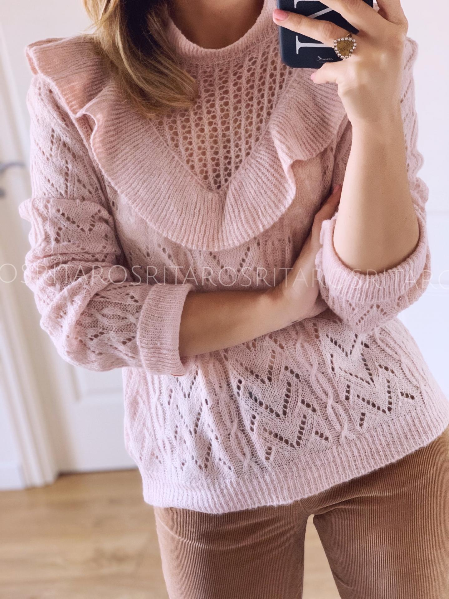 Jersey de punto calado con cuello subido, manga larga y volante en frontal.