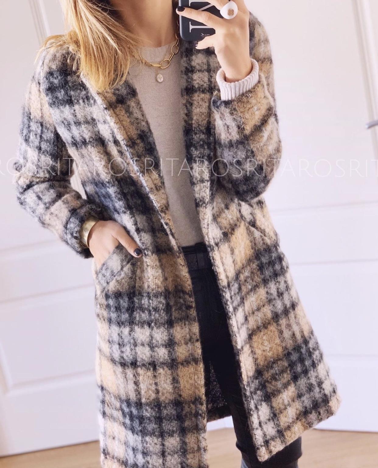 Abrigo largo de corte recto con cuello y solapa. Bolsillos laterales.