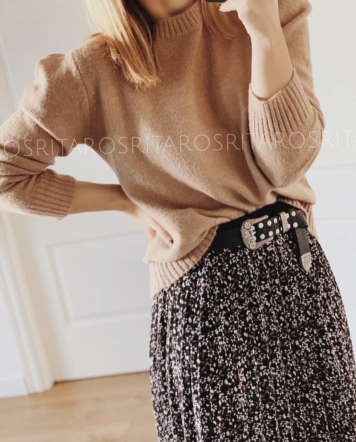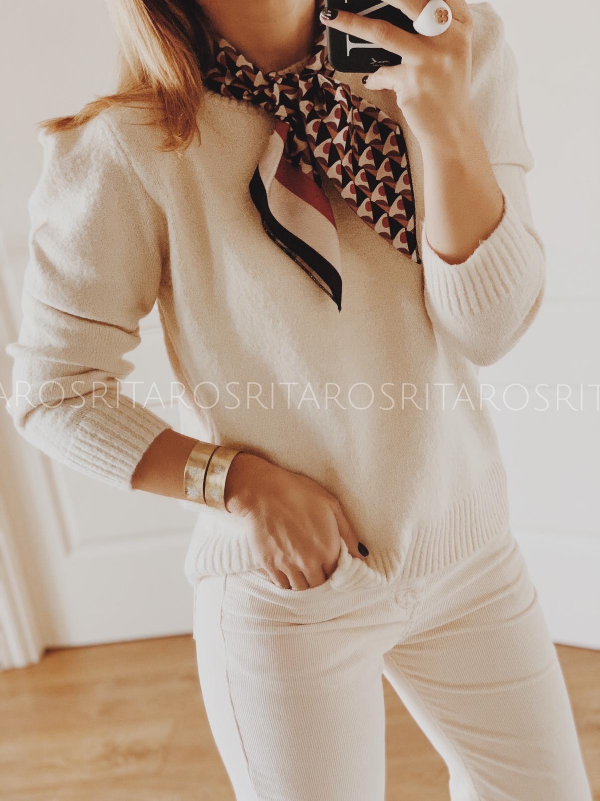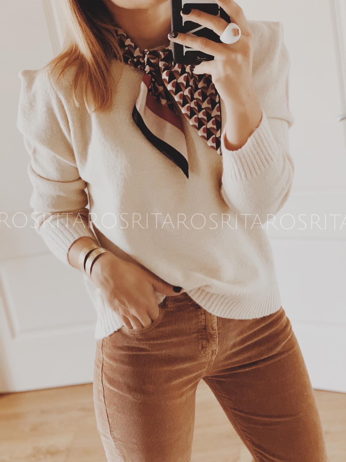 Jersey de punto manga larga y cuello redondo con detalle hombro abullonado.