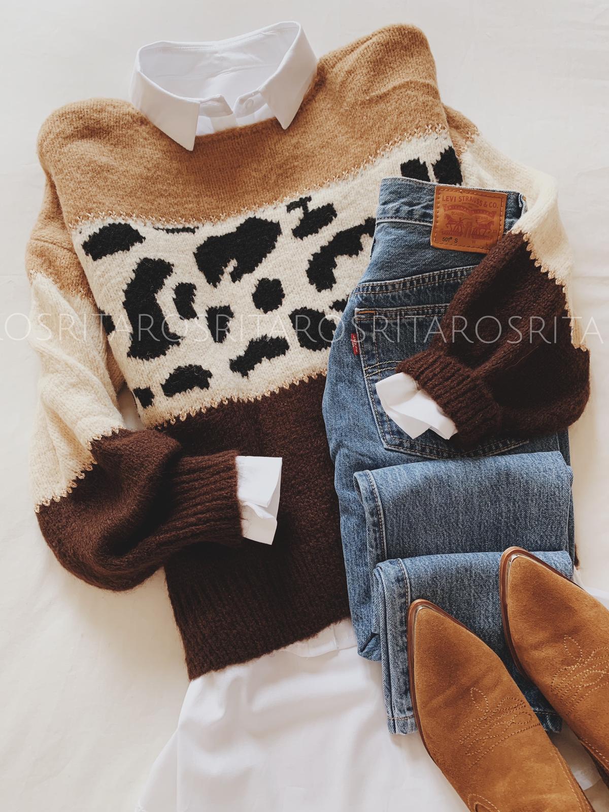 Jersey de punto, manga larga estampado animal print combinando con tonos marrones.