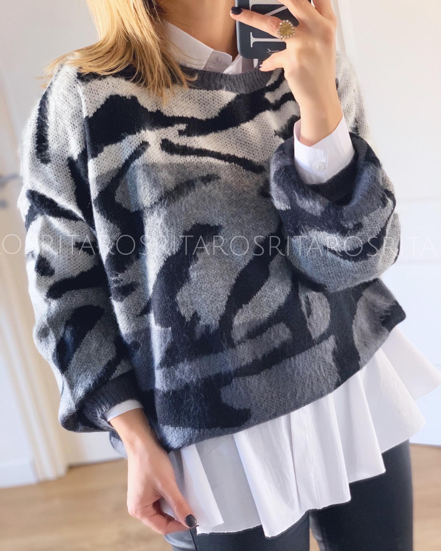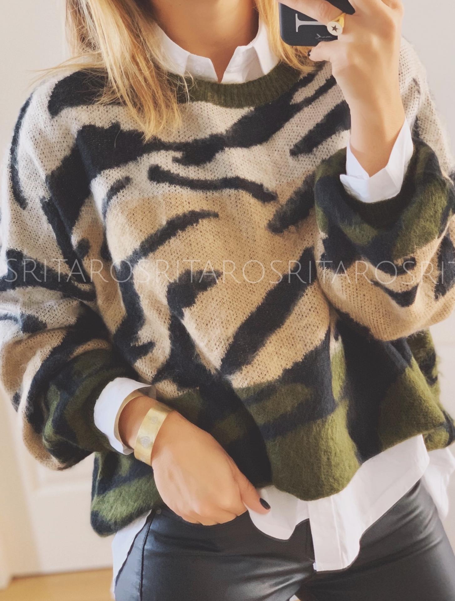 Jersey estampado de manga larga y cuello redondo. Lo hemos combinado con nuestro pantalón recto encerado y la combinación es perfecta.