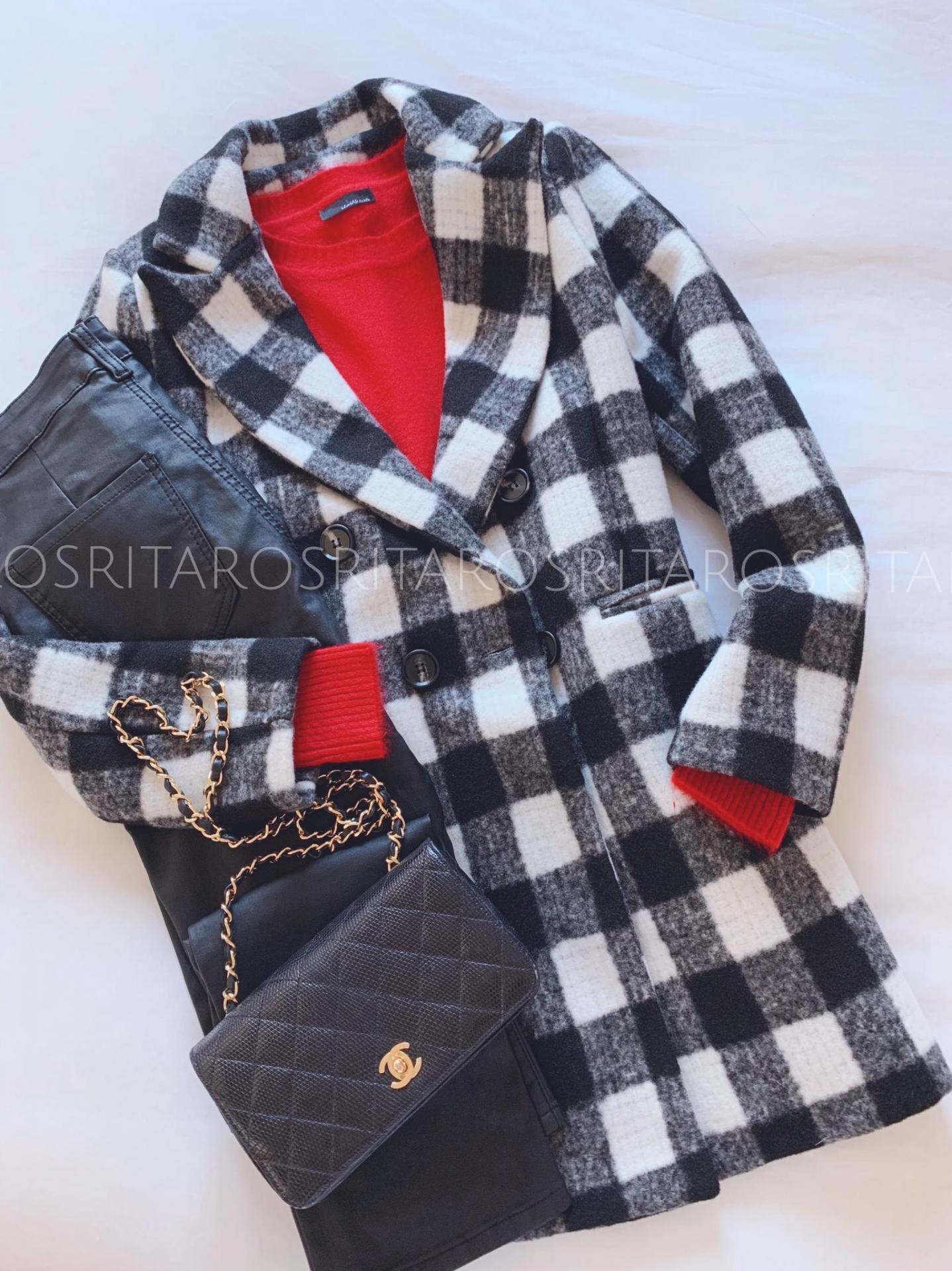 Abrigo de corte recto con cuello y solapa, estampado de cuadros blancos y negros. Corte cruzado y fasos bolsillos frontales.