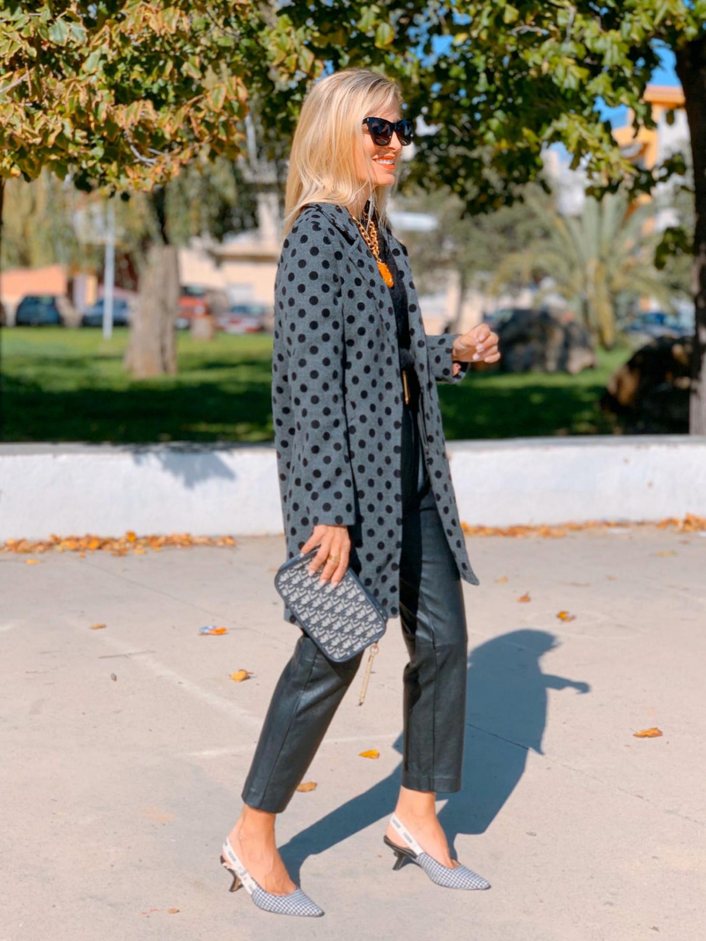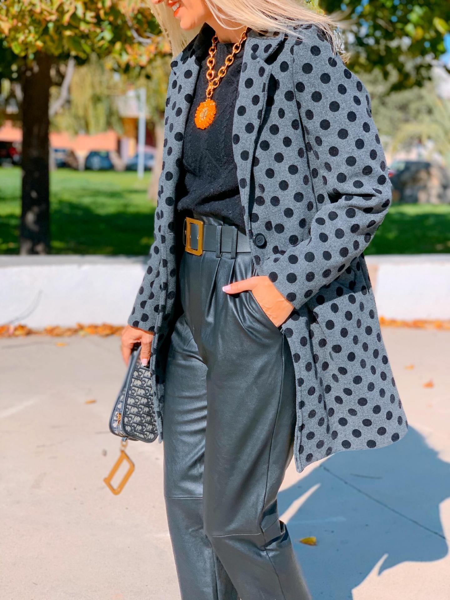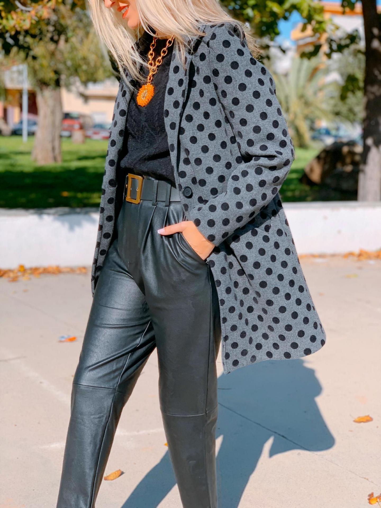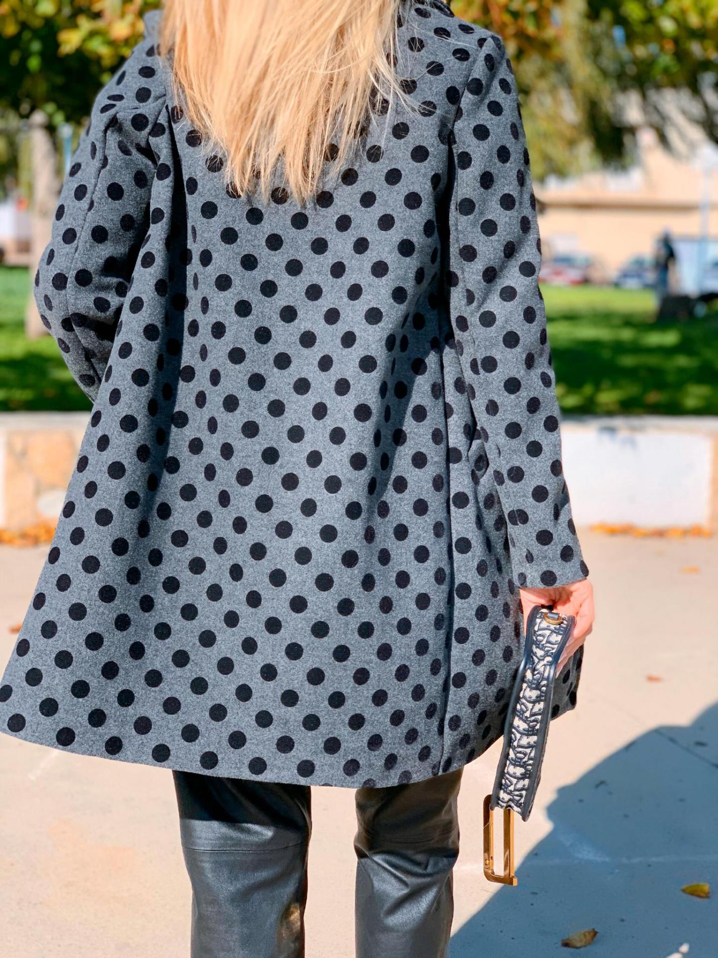 Abrigo de corte recto con cuello y solapa estampado de lunares. Bolsillos frontales.