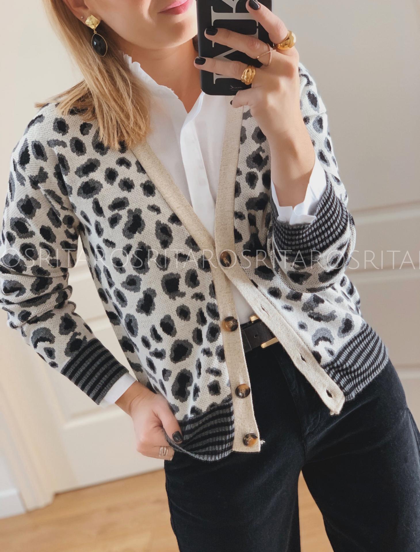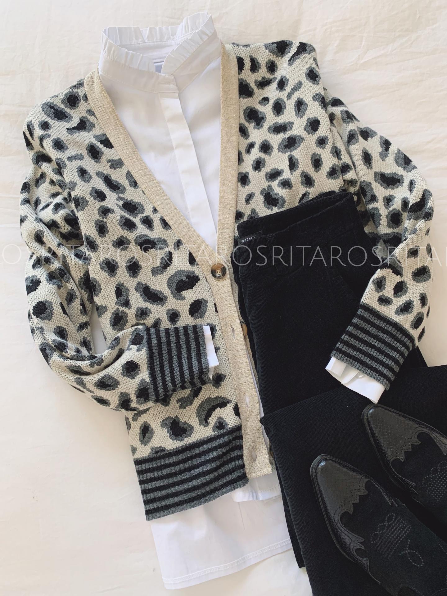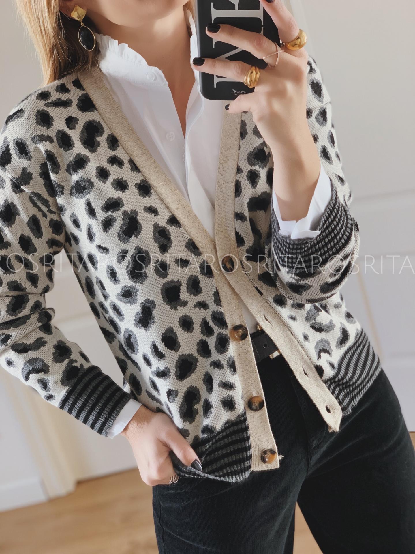 Chaqueta de punto efecto animal print con cintura y puños estampado de rayas. Ribete escote efecto glitter.