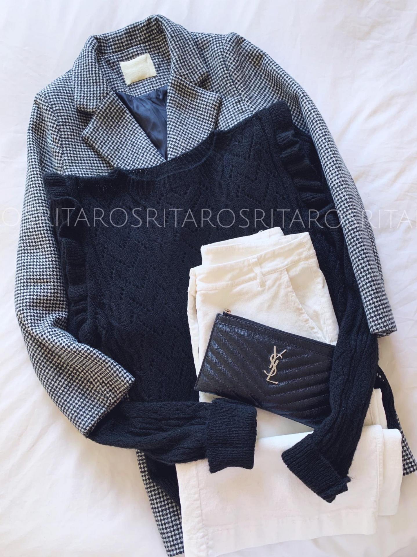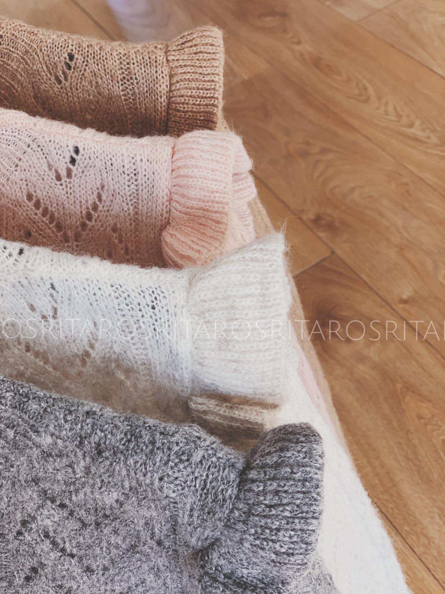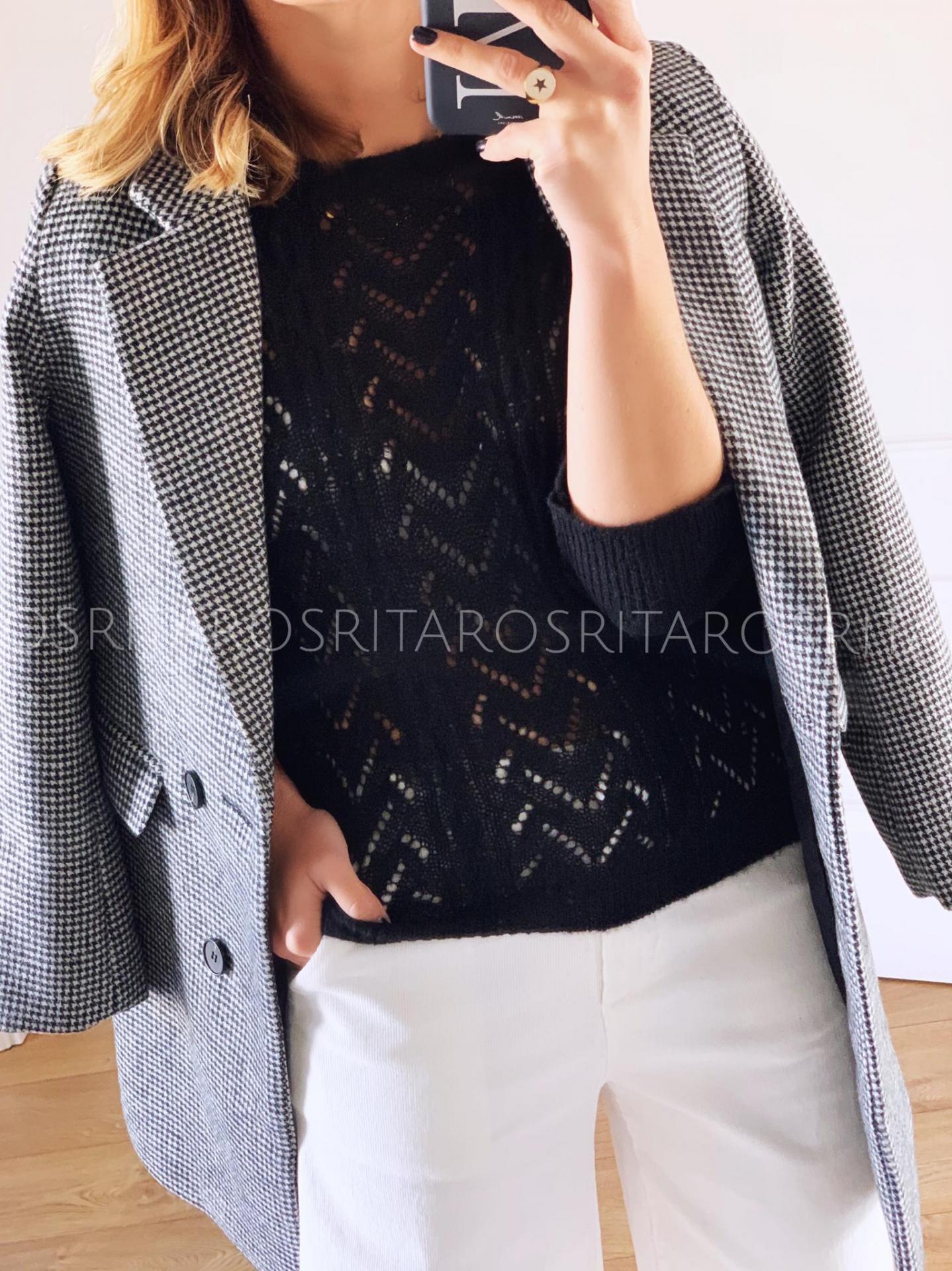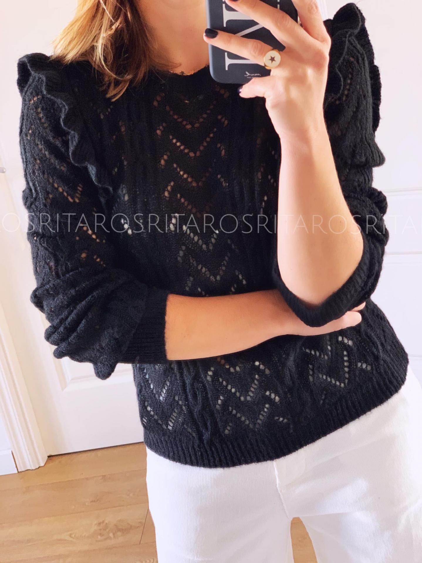 Jersey de punto troquelado de manga larga y cuello redondo. Detalle volante en hombros.
