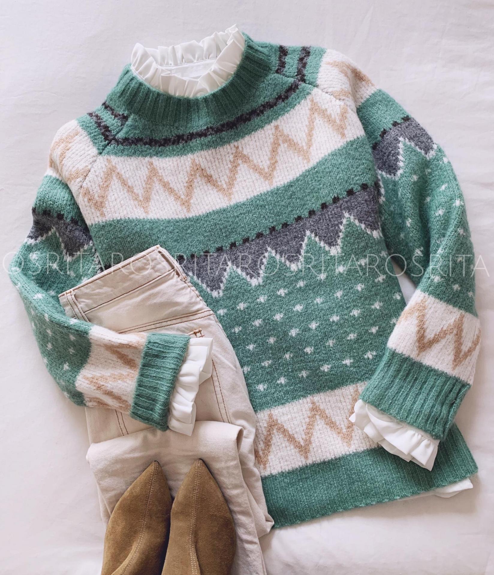Jersey de punto estampado con cuello subido y ribetes acabados en canalé.