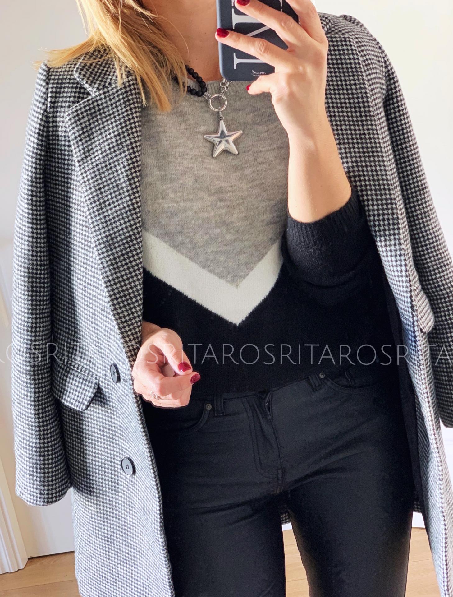 Jersey de punto de manga larga y cuello redondo estampado. Combínalo con nuestro pantalón encerado en negro, nuestra blusa Nicole y nuestro abrigo vichy en blanco y negro y te encantará el resultado.