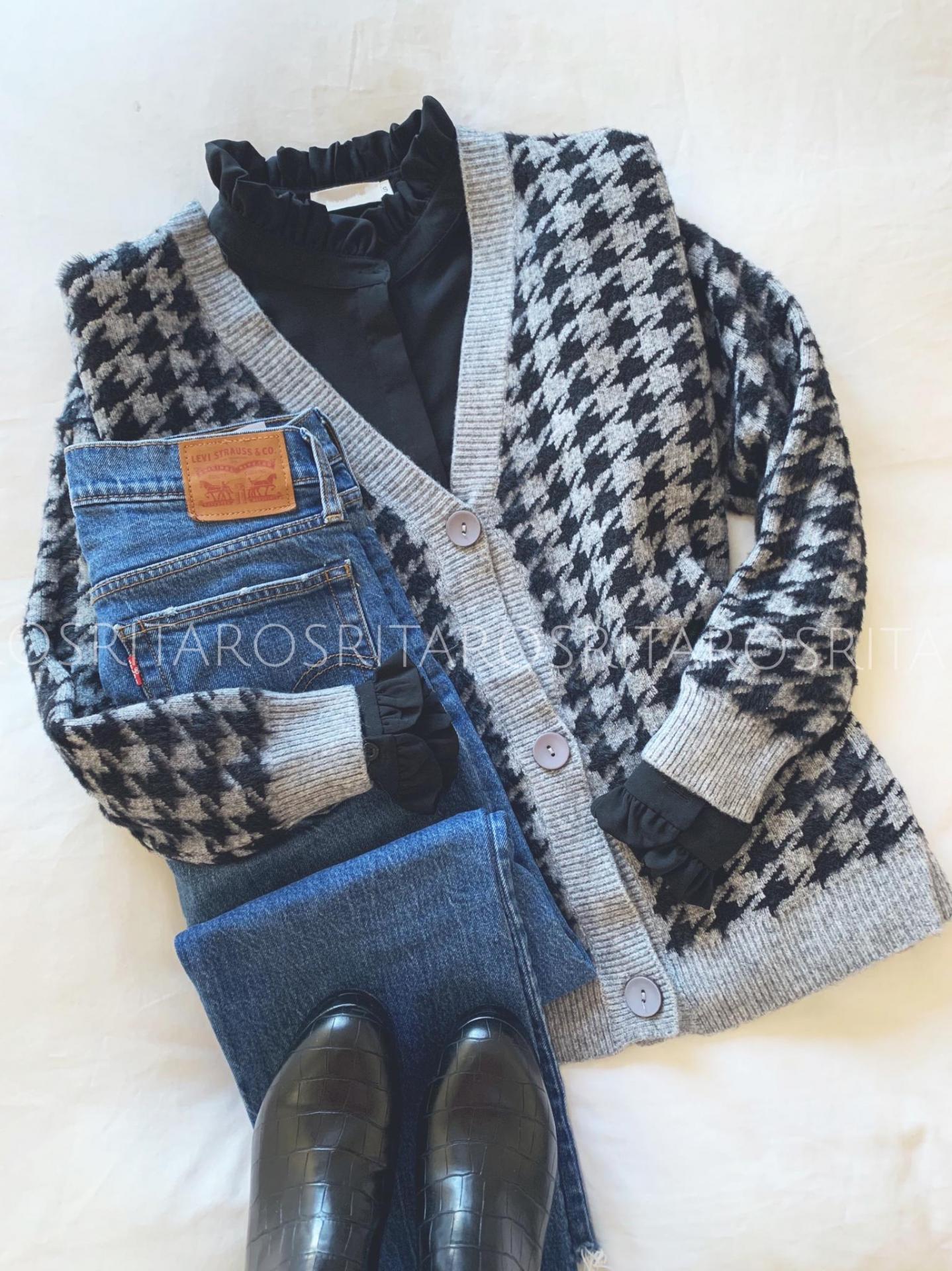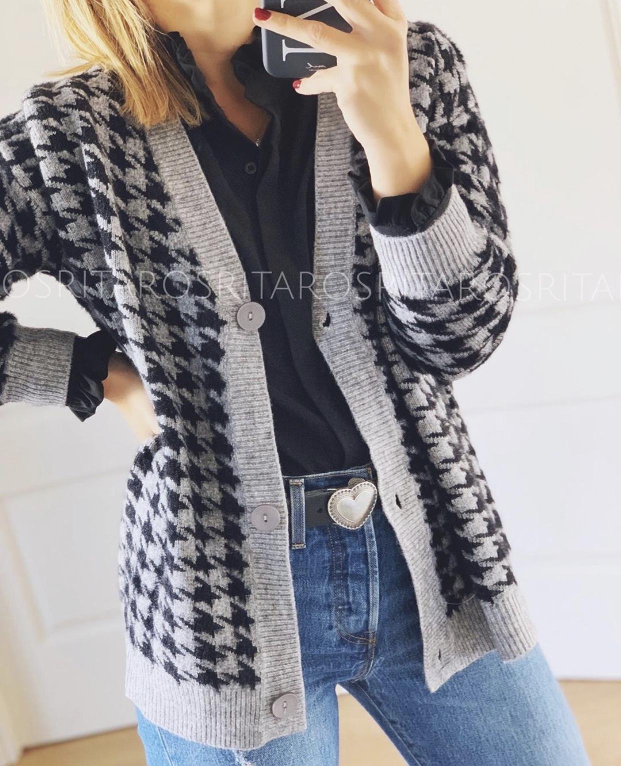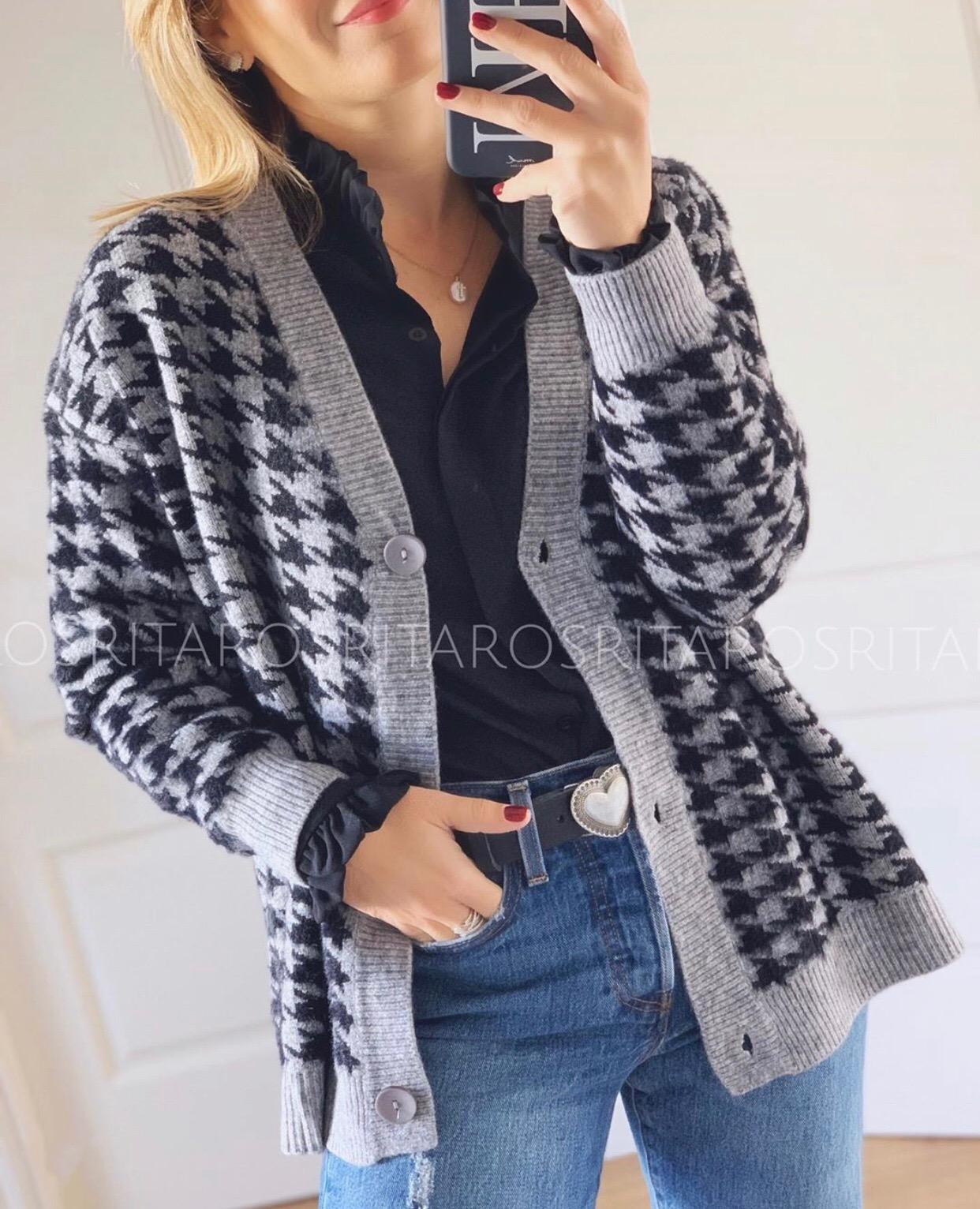 Cárgidan de punto estampado. Cierre frontal con botones. Combínalo con nuestra blusa Nicole en negro, unos jeans y unos botines y te encantará el resultado.