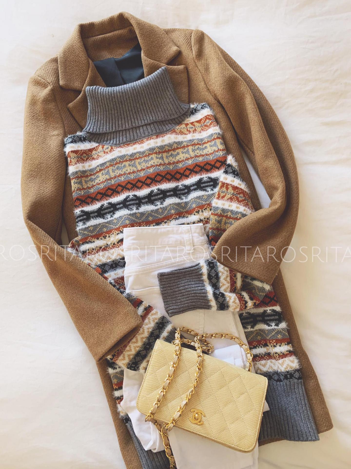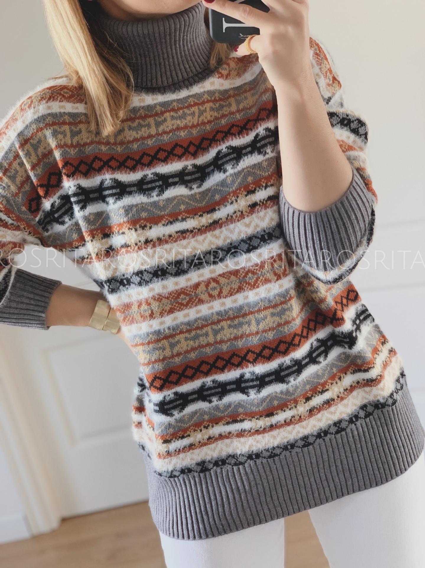 Jersey de punto de manga larga y cuello alto estampado. Combínalo con nuestro Abrigo Louis en Camel y unos jeans en blanco y te encantará el resultado.