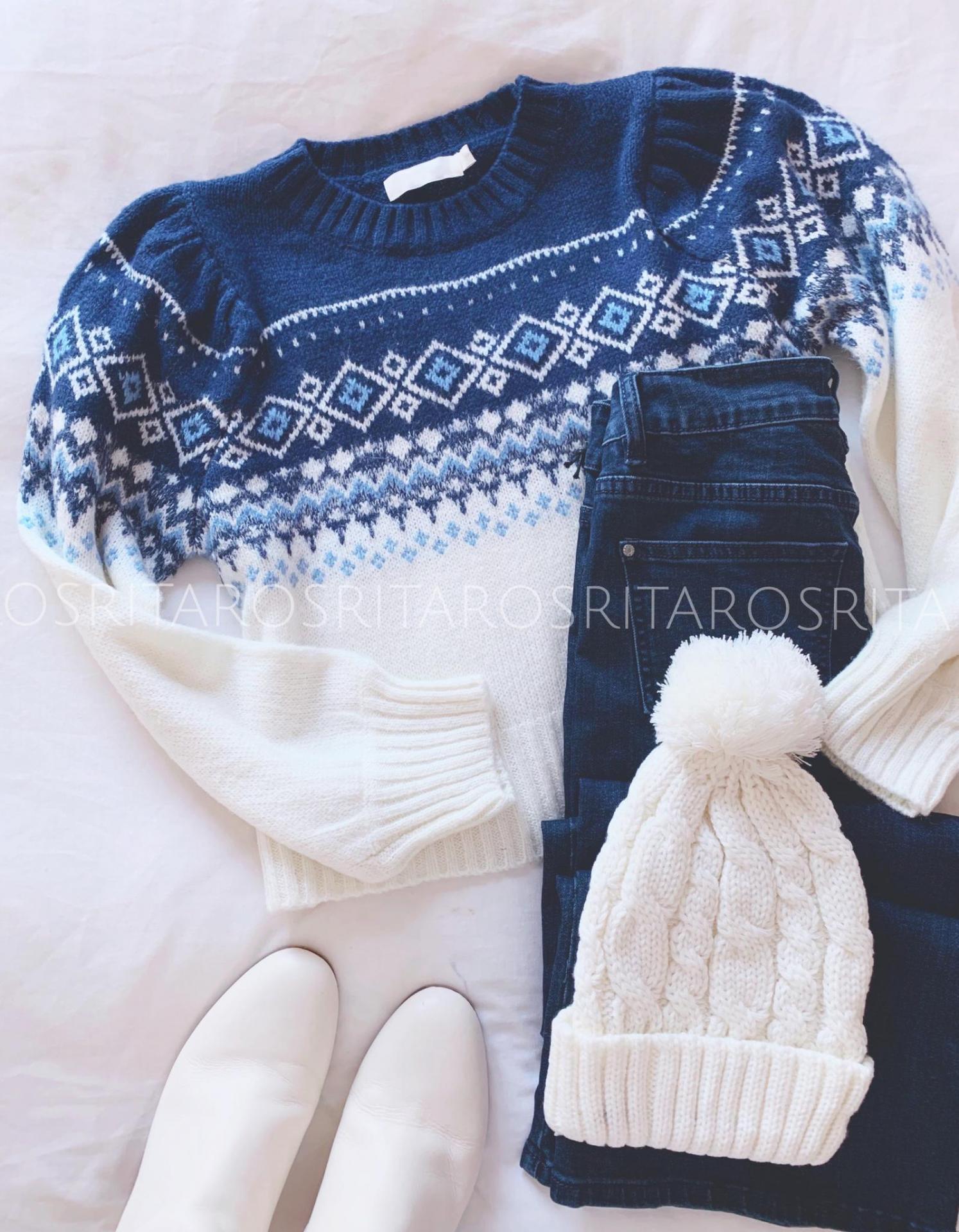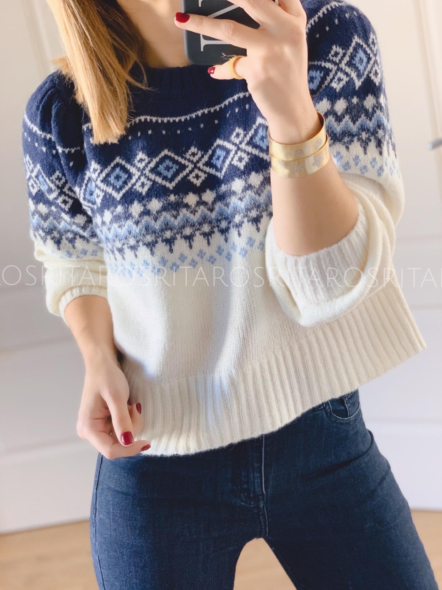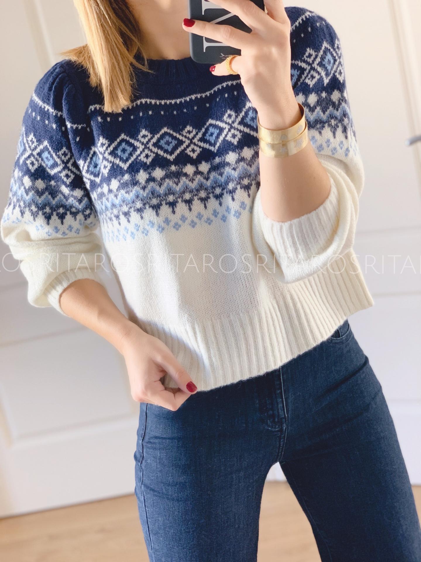 Jersey de punto de manga larga y cuello redondo con un estampado precioso. Combínalo con nuestro pantalón recto y la combinación de colores te encantará.