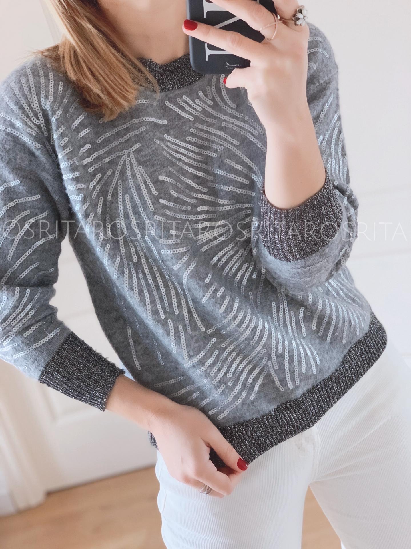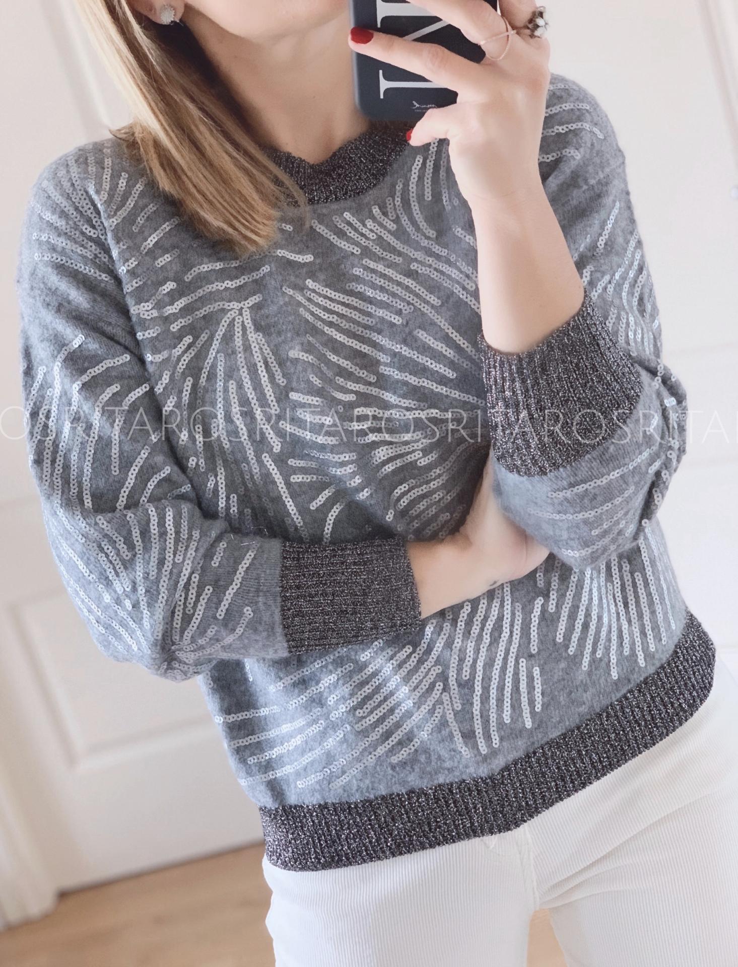 Jersey de punto de maga larga y cuello redondo con lentejuelas bordadas y detalle cuello y puños en glitter.