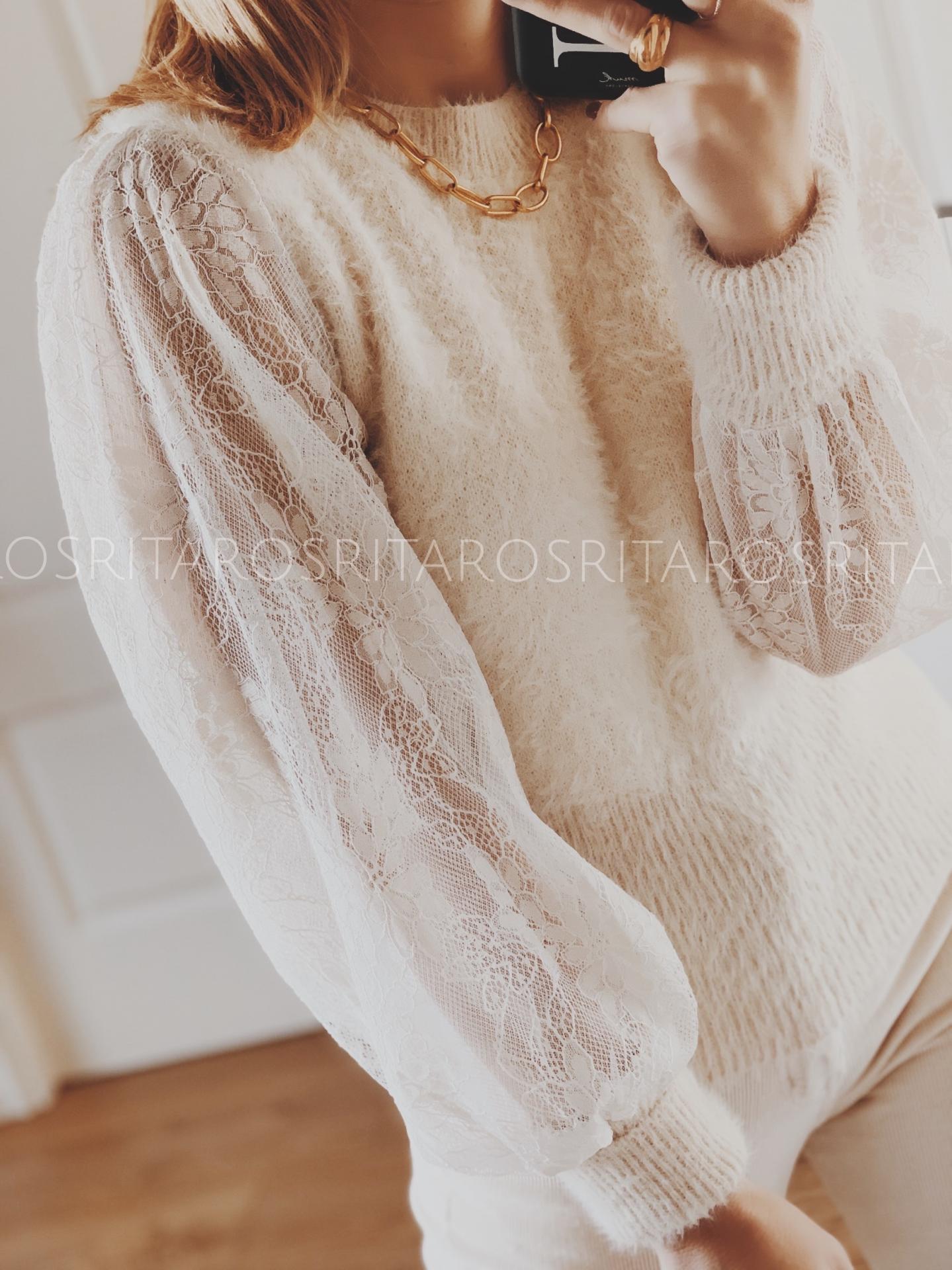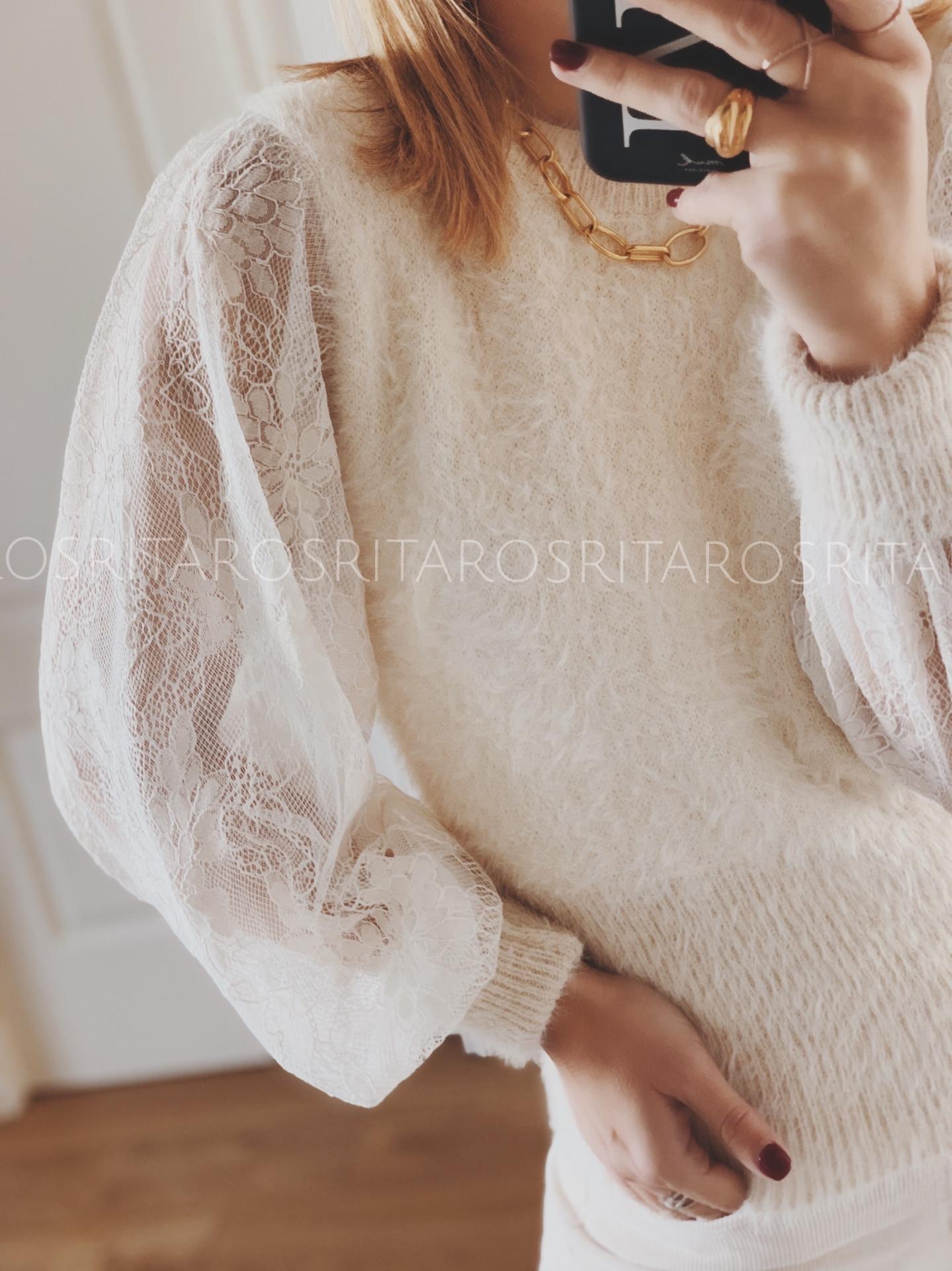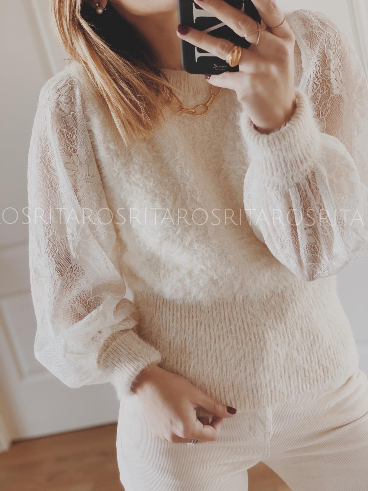 Precioso jersey de punto con efecto pelo y encaje en mangas. Una monada de prenda ideal para lucir en fiestas.