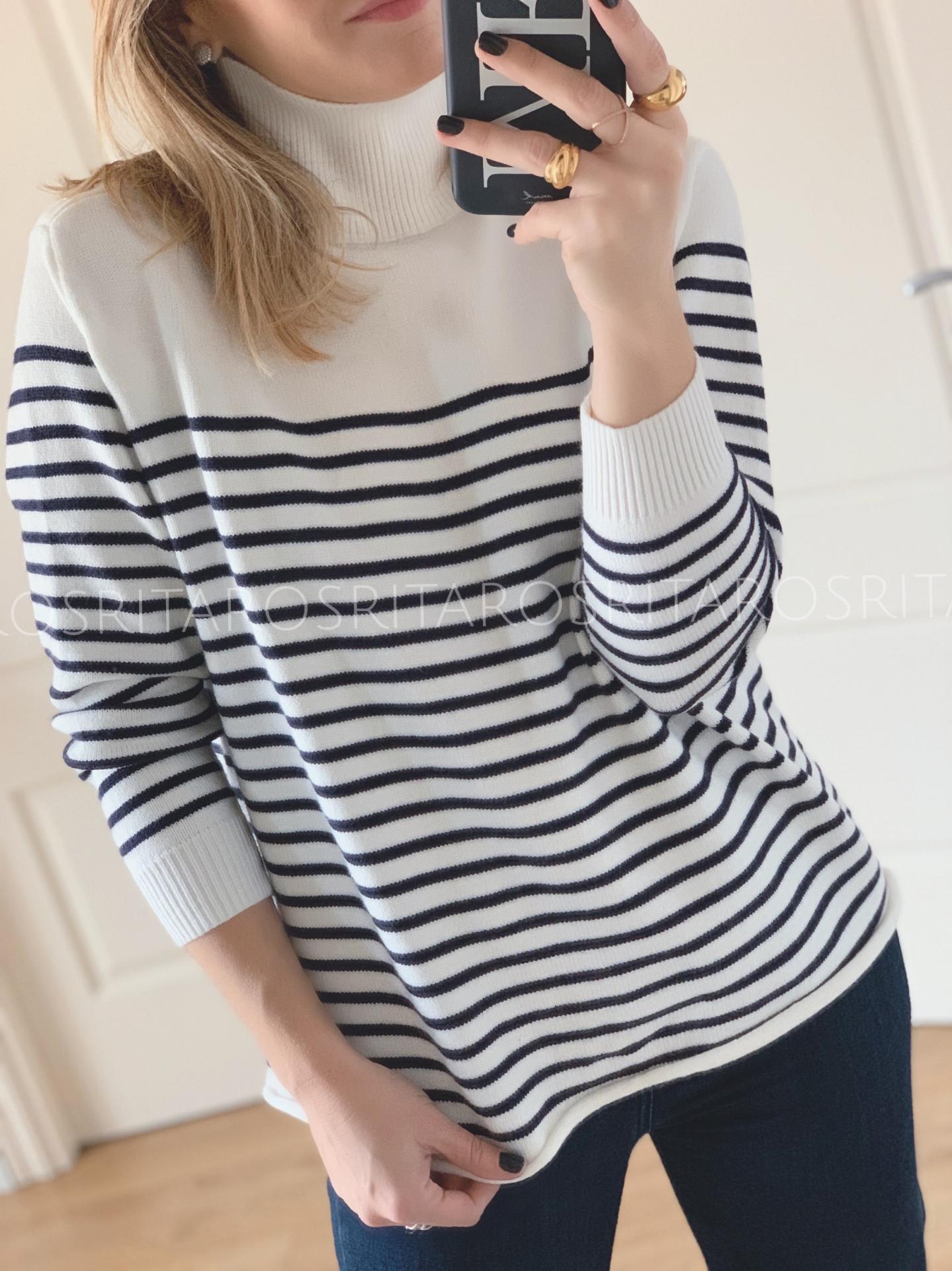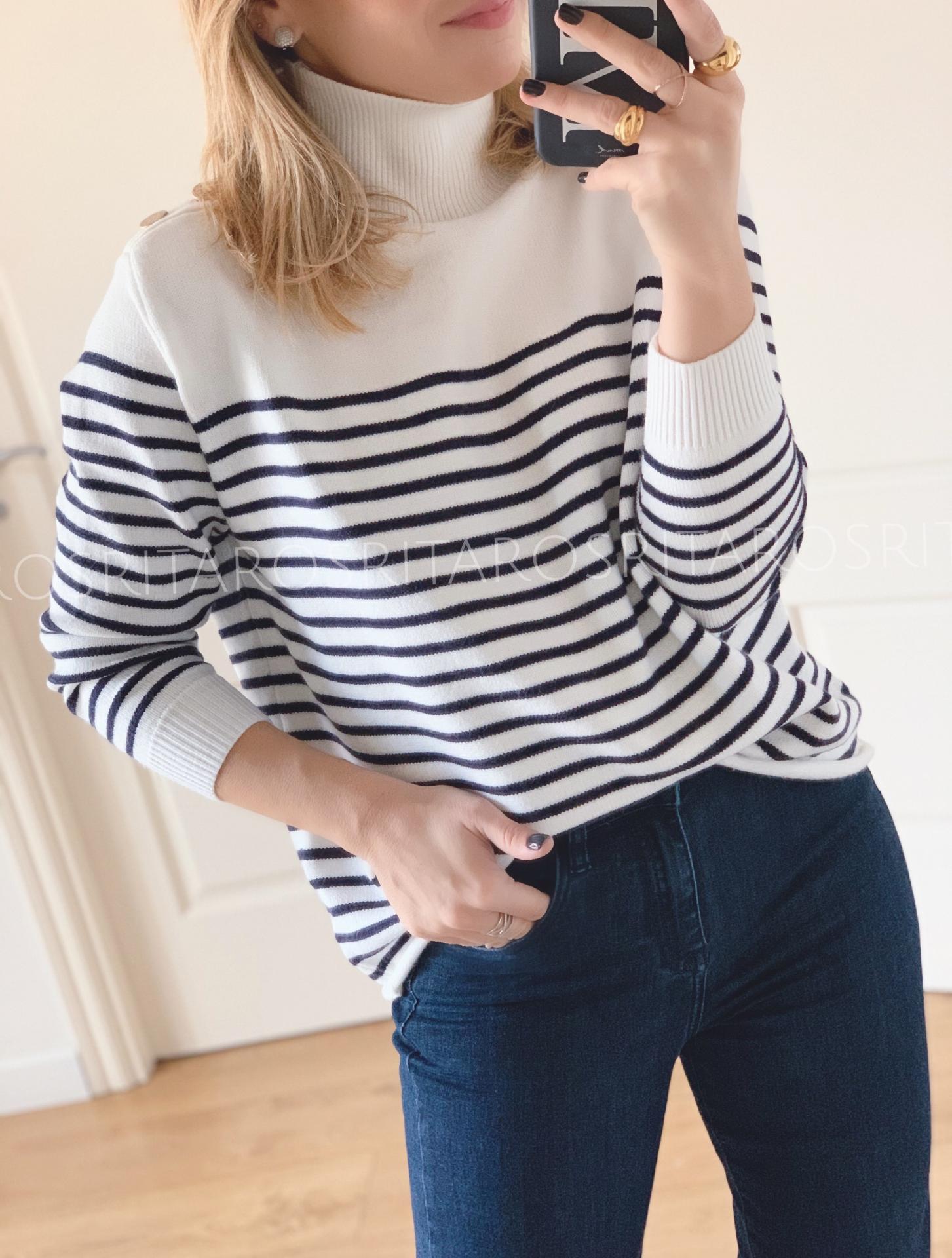 Jersey de punto de manga larga y cuello subido estampado de rayas con detalle botones dorados en hombro.