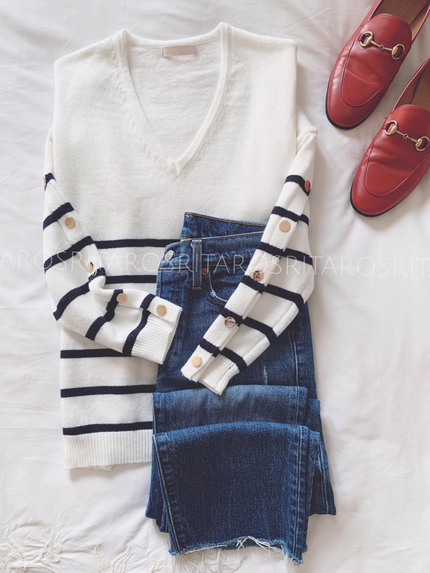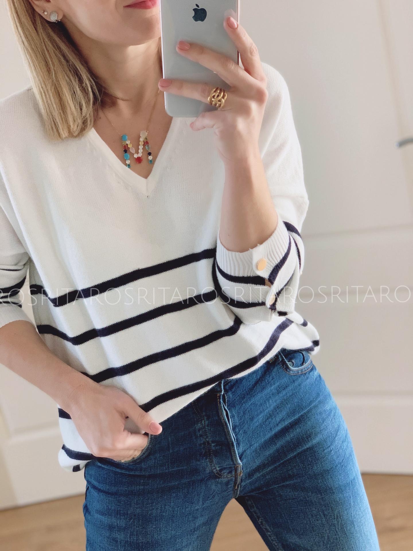 Nuevo Jersey de rayas en azul marino con escote de pico y botons dorados en las mangas.