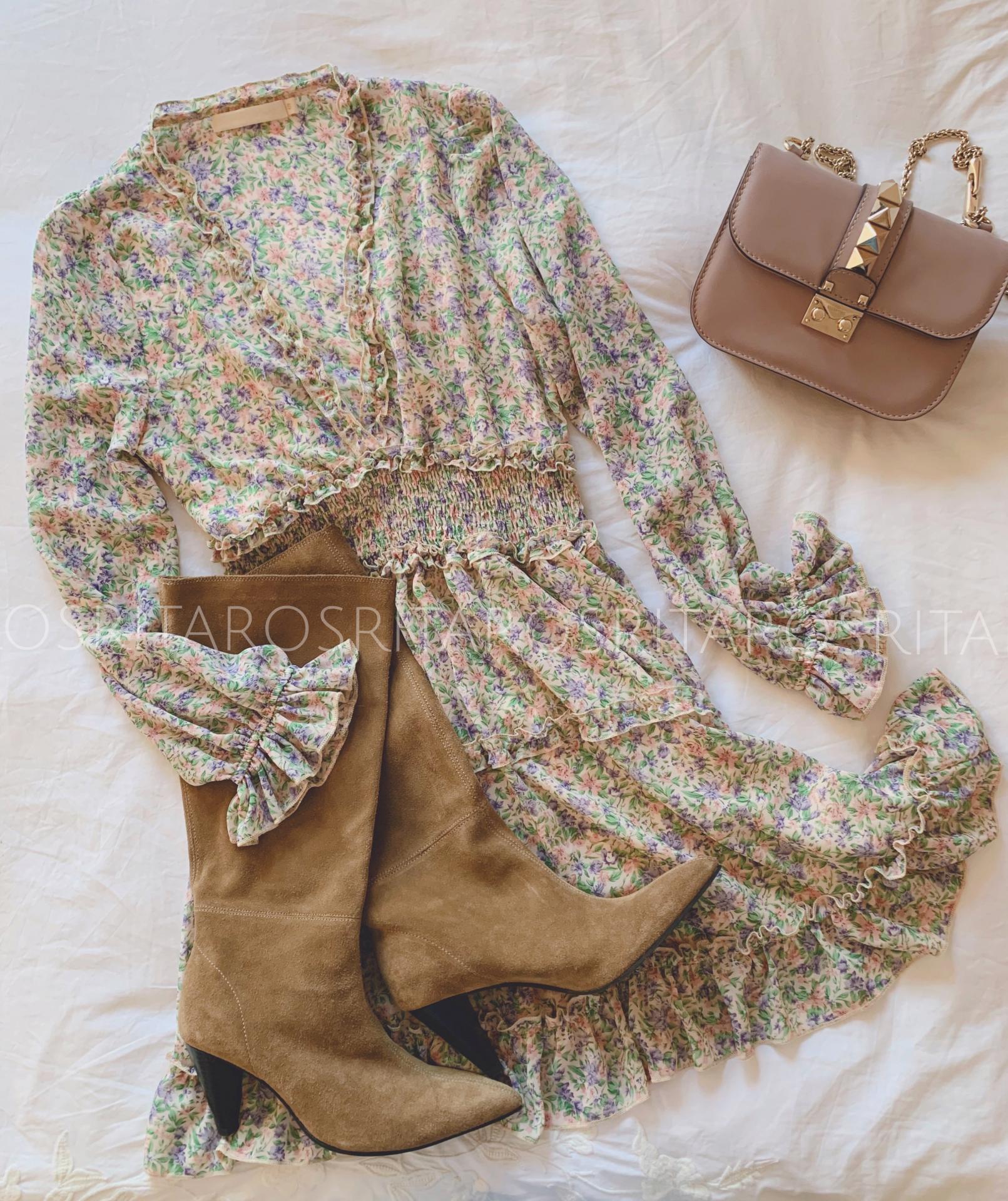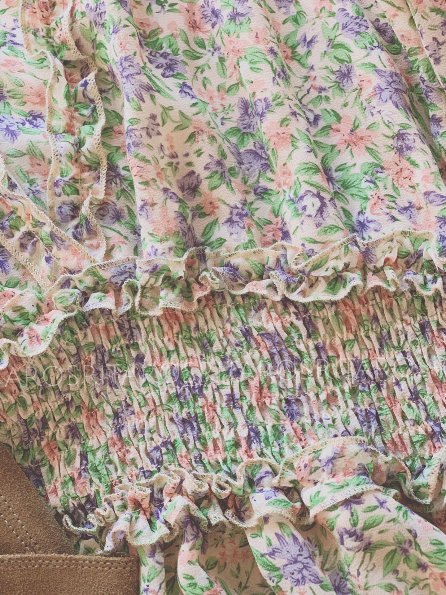 Una monada de vestido de gasa con forro, escote en pico y mini volantes.
