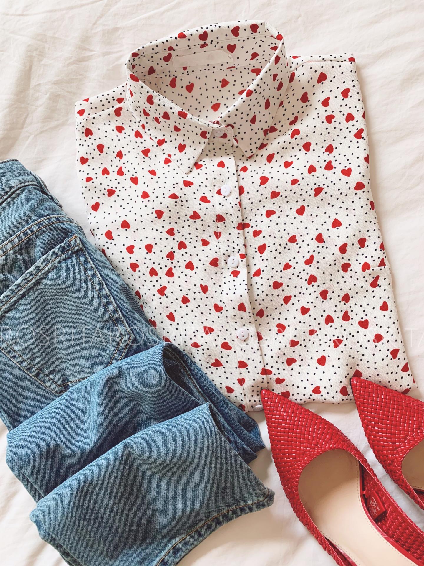 Nueva Blusa en crepe con detalles de corazones rojos y topitos en azul marino.