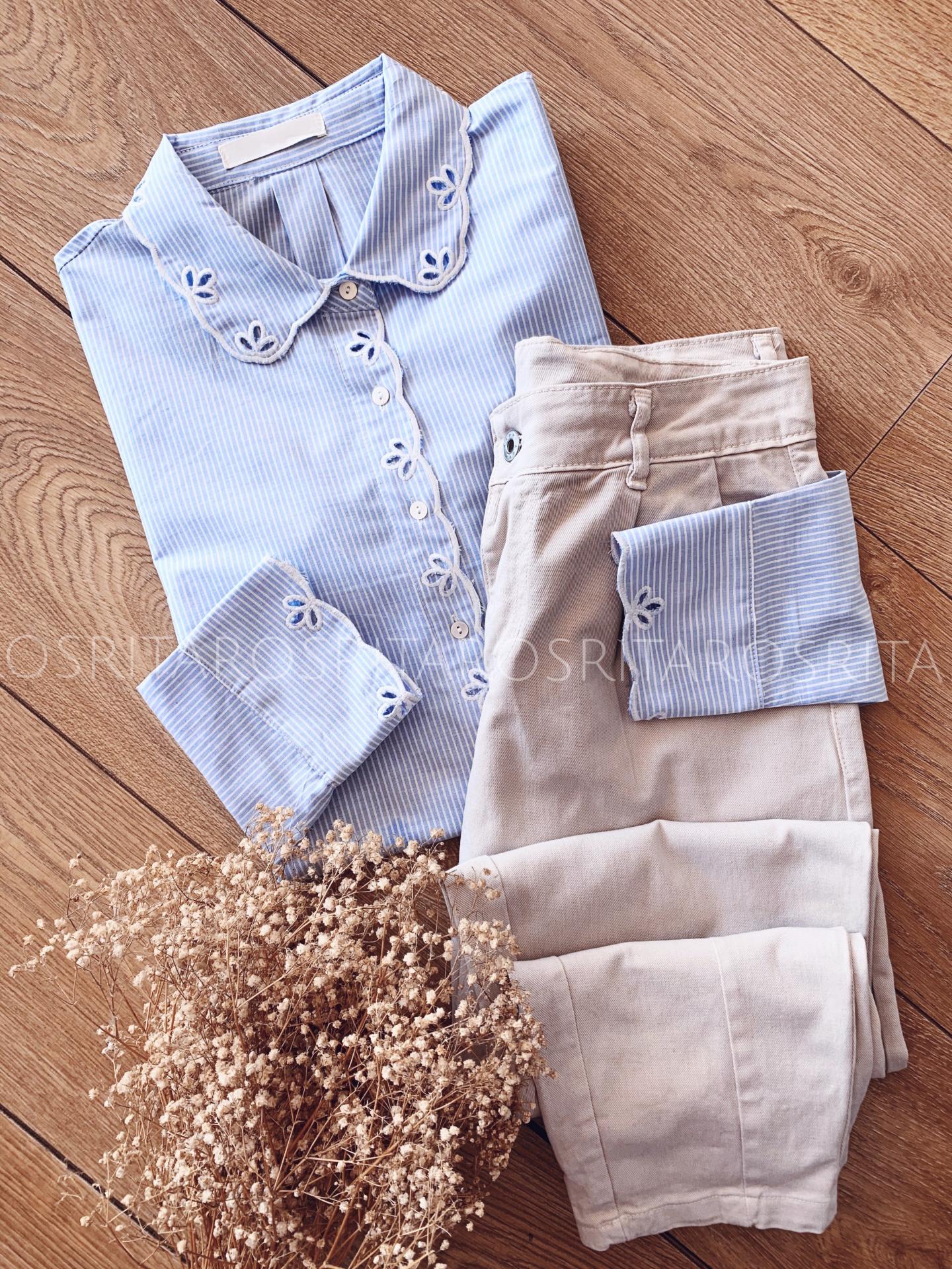 Nueva camisa de Rayas en azul cielo y blanco y detalles bordados en cuello,escote y puños.