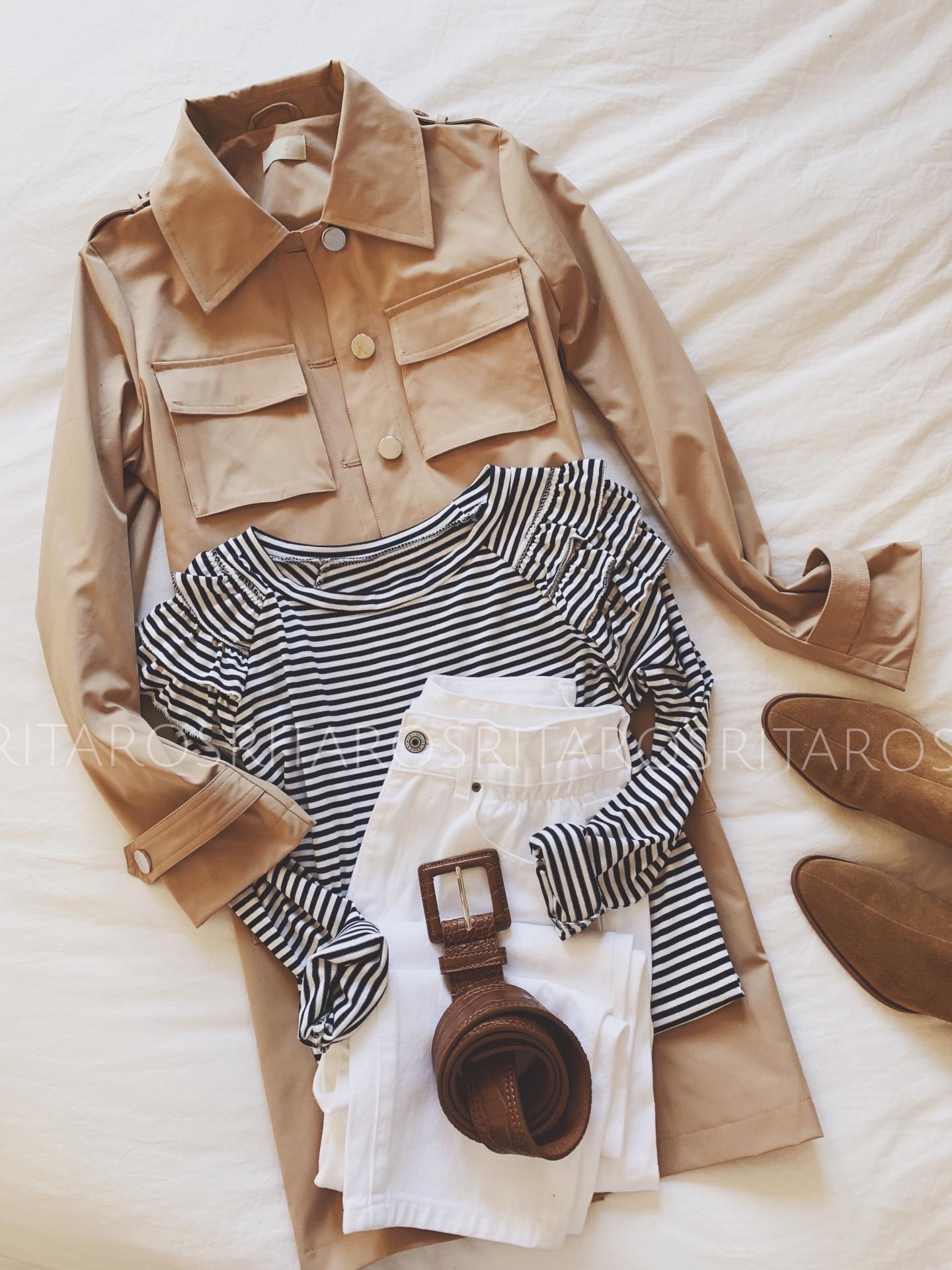 Nueva camiseta de rayas en azul marino y blanco y detalle de volantes en los hombros.