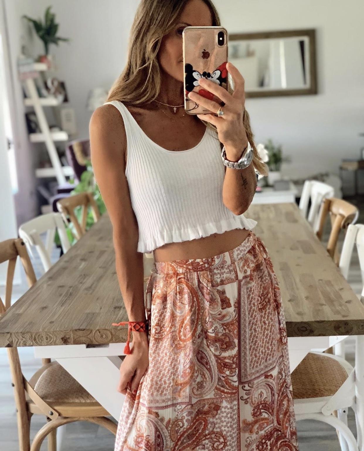 Nueva falda con estampado Paisley de gasa con forro y un tejido espectacular. Parte trasera con goma y delantera con franja lisa ¡IDEAL!