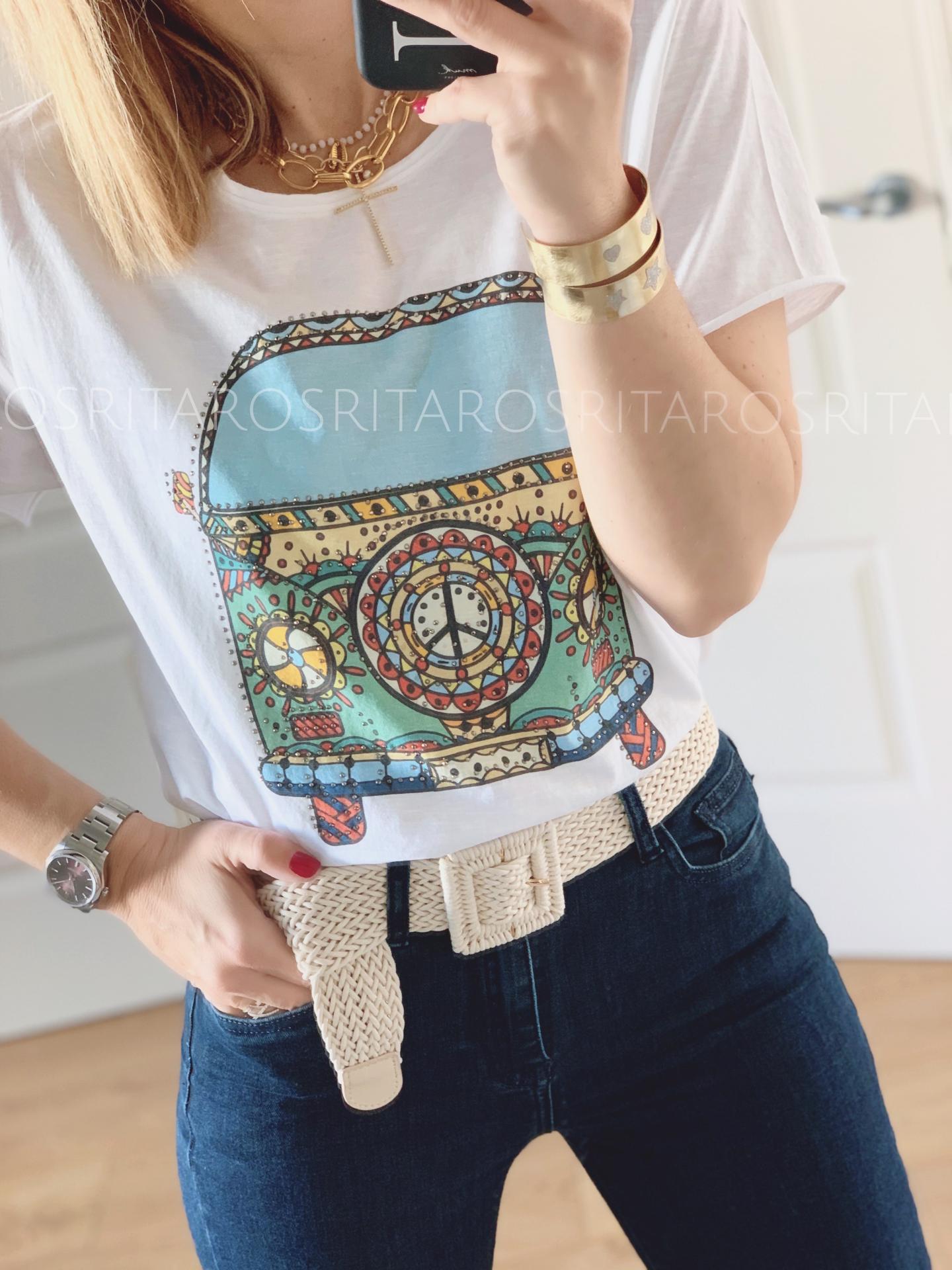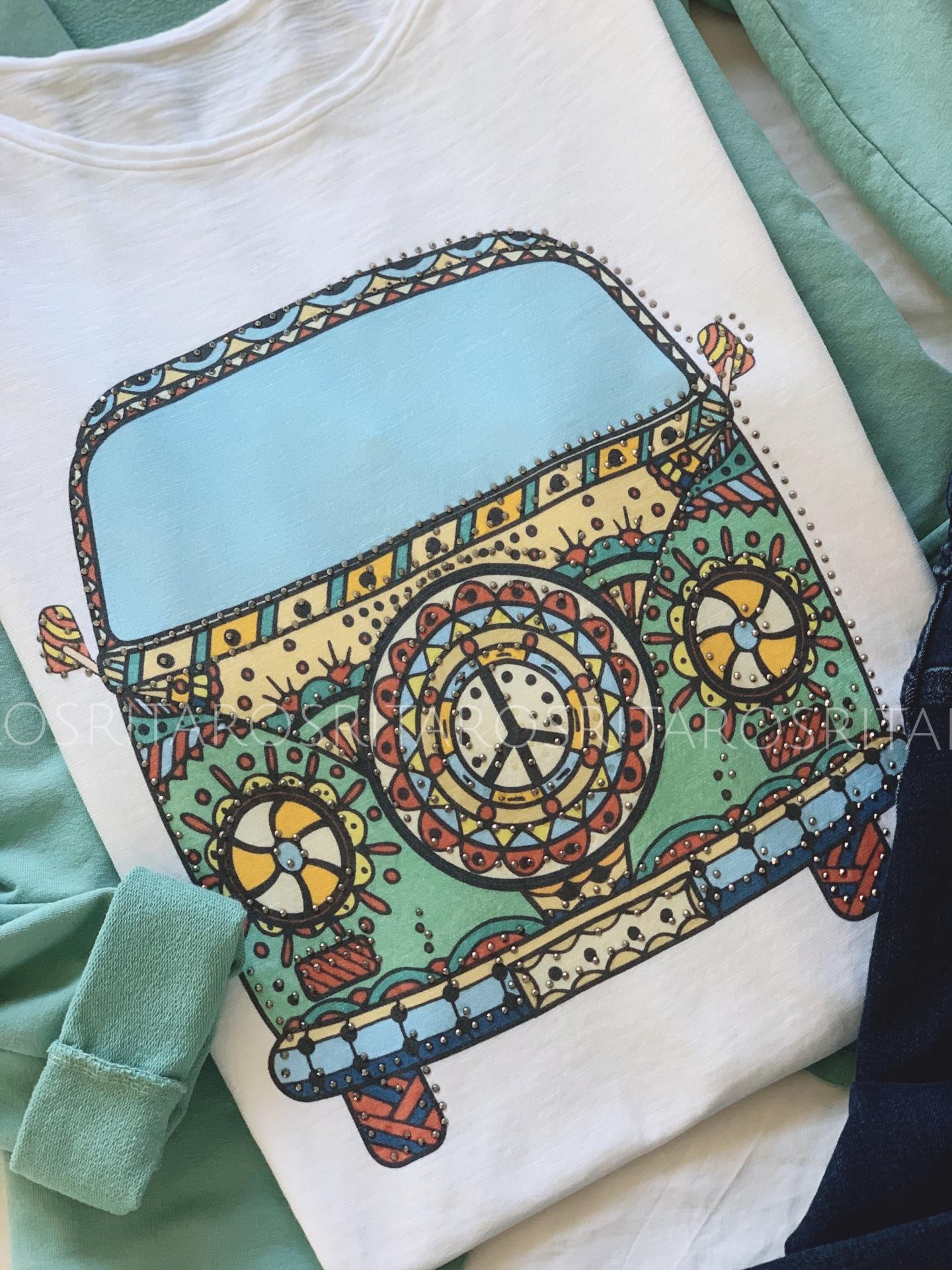 Una monada de camiseta en manga corta con autobús impresa y brillantitos.