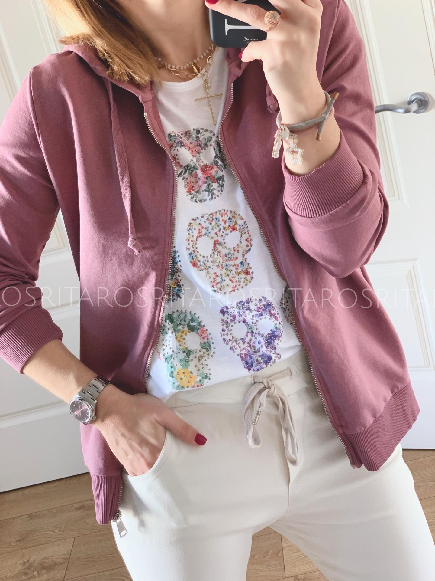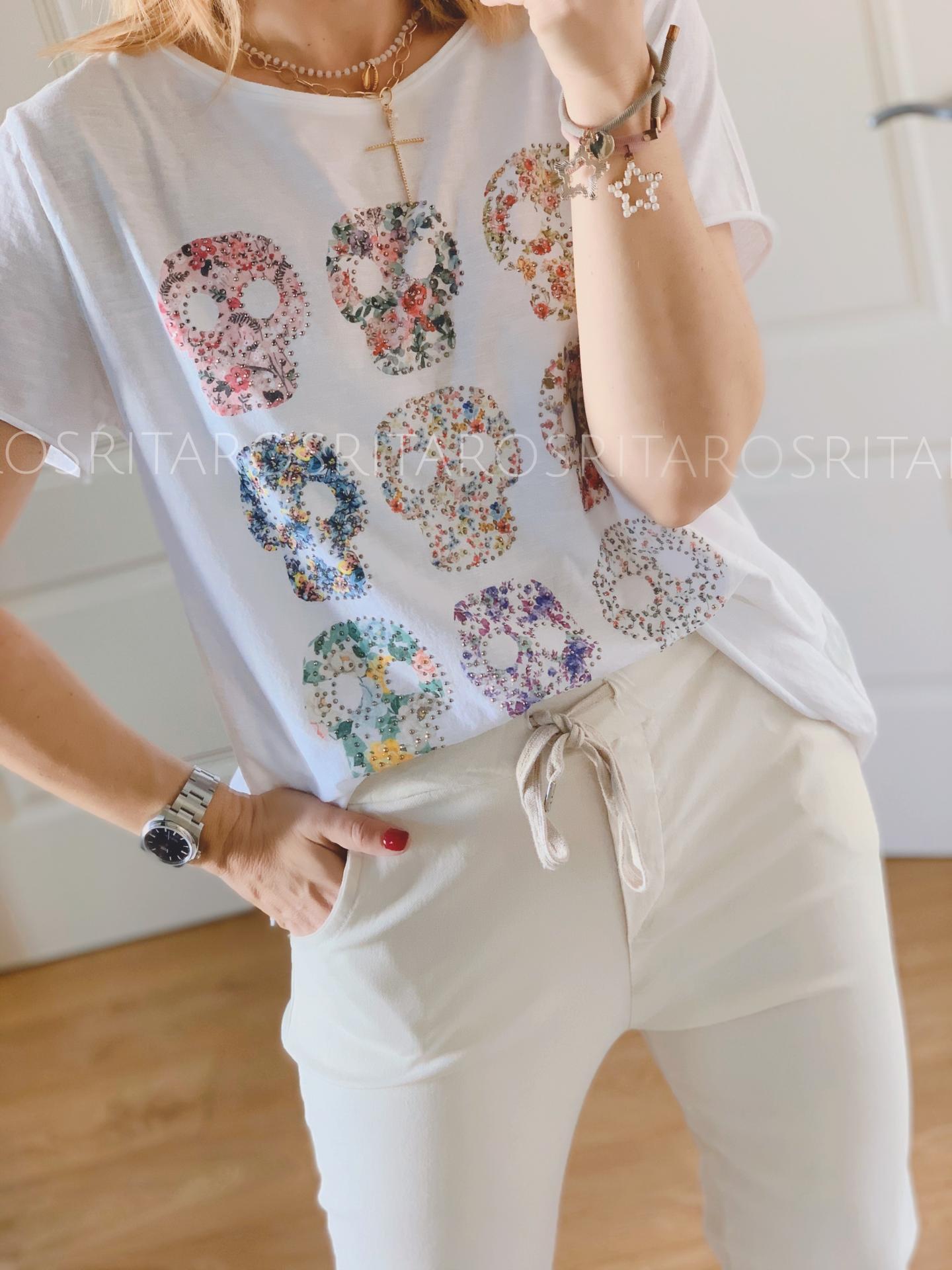 Nueva camiseta de manga corta ligeramente acampanada con dibujo impreso de calaveras y brillantes.